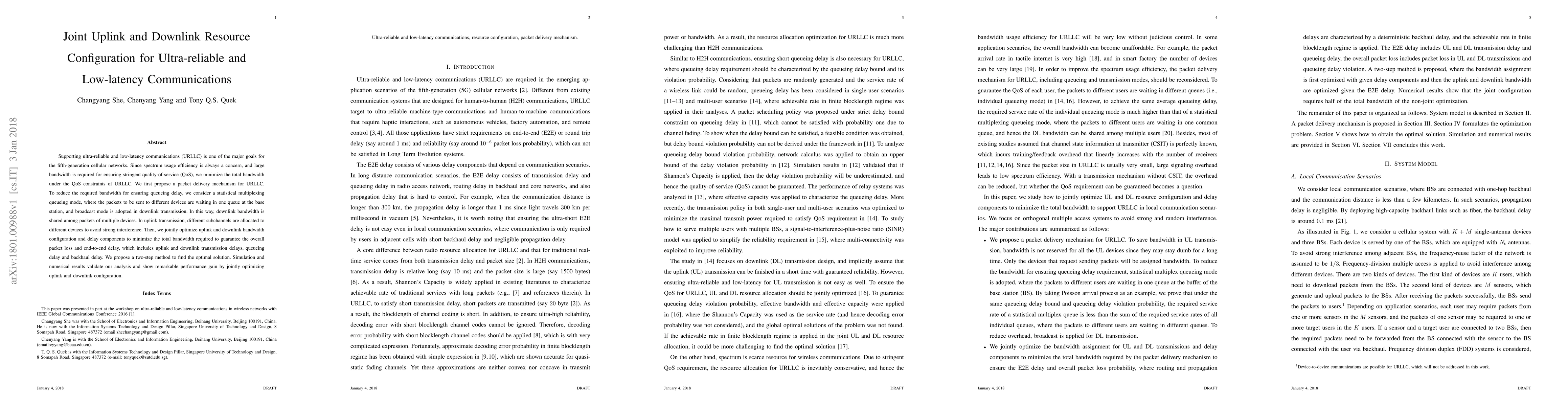 Supporting ultra-reliable and low-latency communications (URLLC) is one of the major goals for the fifth-generation cellular networks. Since spectrum usage efficiency is always a concern, and large bandwidth is required for ensuring stringent quality-of-service (QoS), we minimize the total bandwidth under the QoS constraints of URLLC. We first propose a packet delivery mechanism for URLLC. To reduce the required bandwidth for ensuring queueing delay, we consider a statistical multiplexing queueing mode, where the packets to be sent to different devices are waiting in one queue at the base station, and broadcast mode is adopted in downlink transmission. In this way, downlink bandwidth is shared among packets of multiple devices. In uplink transmission, different subchannels are allocated to different devices to avoid strong interference. Then, we jointly optimize uplink and downlink bandwidth configuration and delay components to minimize the total bandwidth required to guarantee the overall packet loss and end-to-end delay, which includes uplink and downlink transmission delays, queueing delay and backhaul delay. We propose a two-step method to find the optimal solution. Simulation and numerical results validate our analysis and show remarkable performance gain by jointly optimizing uplink and downlink configuration.