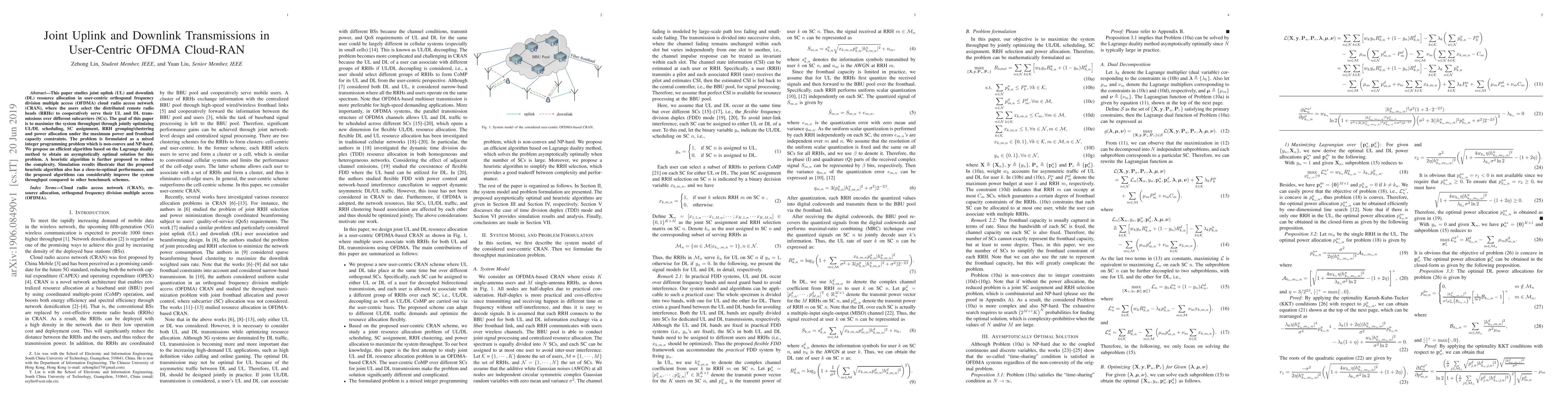 This paper proposes algorithms to optimize joint uplink and downlink transmissions in user-centric OFDMA CRANs for improved system throughput. Simulation results show the proposed algorithms achieve close-to-optimal performance and significantly improve system efficiency.