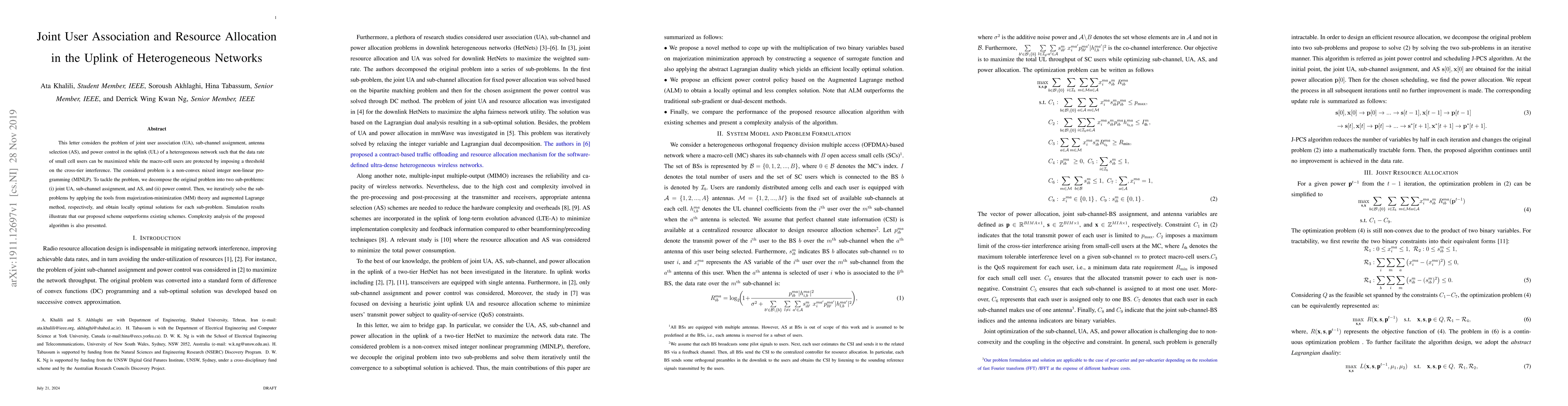 This letter considers the problem of joint user association (UA), sub-channel assignment, antenna selection (AS), and power control in the uplink (UL) of a heterogeneous network such that the data rate of small cell users can be maximized while the macro-cell users are protected by imposing a threshold on the cross-tier interference. The considered problem is a non-convex mixed integer non-linear programming (MINLP). To tackle the problem, we decompose the original problem into two sub-problems: (i) joint UA, sub-channel assignment, and AS, and (ii) power control. Then, we iteratively solve the subproblems by applying the tools from majorization-minimization (MM) theory and augmented Lagrange method, respectively, and obtain locally optimal solutions for each sub-problem. Simulation results illustrate that our proposed scheme outperforms existing schemes. Complexity analysis of the proposed algorithm is also presented.