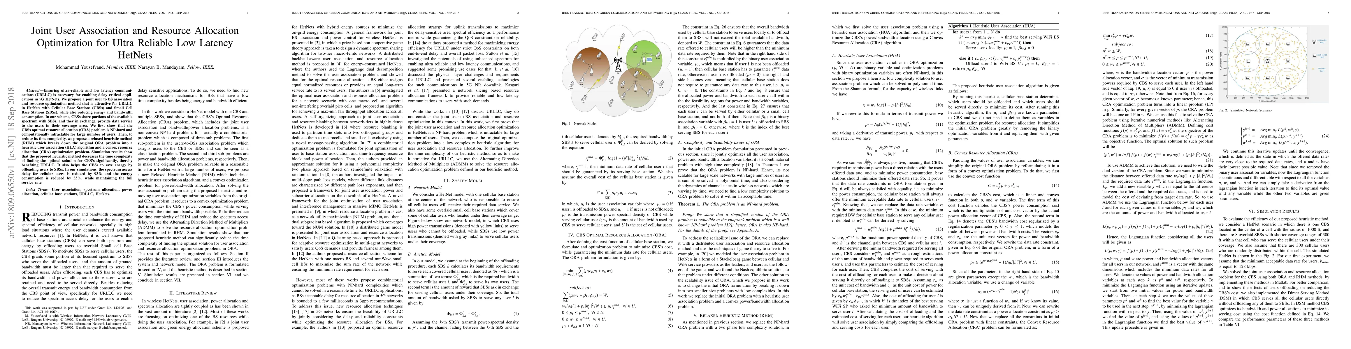 This paper proposes a joint user association and resource allocation optimization method for ultra-reliable and low latency communications in 5G heterogeneous networks. The method reduces energy and bandwidth consumption by offloading users to small cell base stations, while significantly decreasing computational complexity through a relaxed heuristic method.