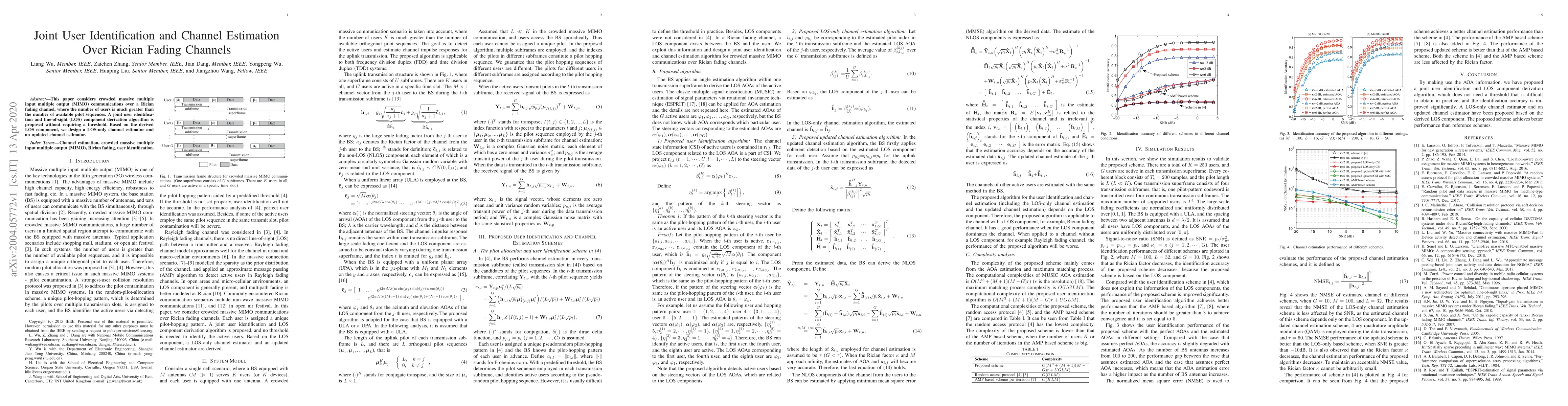 A joint user identification and channel estimation algorithm is proposed for crowded MIMO communications over Rician fading channels, enabling accurate LOS component derivation without requiring a threshold.