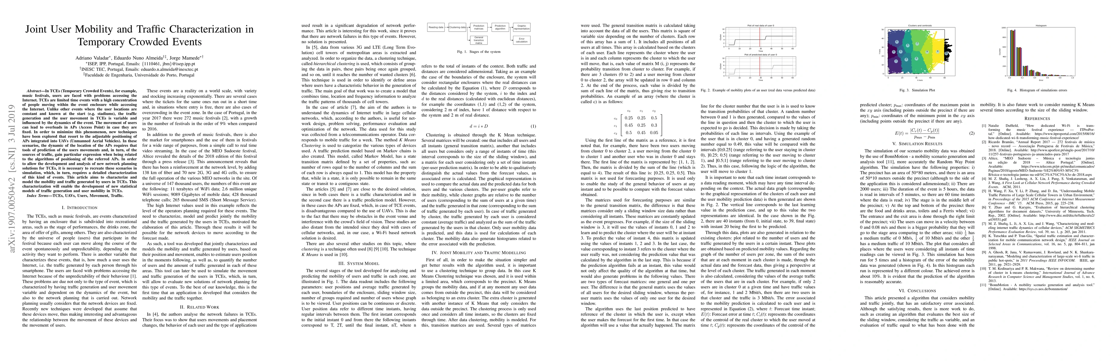 In TCEs (Temporary Crowded Events), for example, music festivals, users are faced with problems accessing the Internet. TCEs are limited time events with a high concentration of people moving within the event enclosure while accessing the Internet. Unlike other events where the user locations are constant and known at the start (e.g. stadiums), the traffic generation and the user movement in TCEs is variable and influenced by the dynamics of the event. The movement of users can lead to overloads in APs (Access Point) in case they are fixed. In order to minimize this phenomenon, new techniques have been explored that resort to the adjustable positioning of APs integrated into UAVs (Unmanned Aerial Vehicles). In these scenarios, the dynamic of the location of the APs requires that tools of prediction of the users movements and, in turn, of the sources of traffic, gain particular expression when being related to the algorithms of positioning of the referred APs. In order to allow the development and analysis of new network planning solutions for TCEs, it is necessary to recreate these scenarios in simulation, which, in turn, requires a detailed characterization of this kind of events. This article aims to characterize and model the mobility and traffic generated by users in TCEs. This characterization will enable the development of new statistical models of traffic generation and user mobility in TCEs.