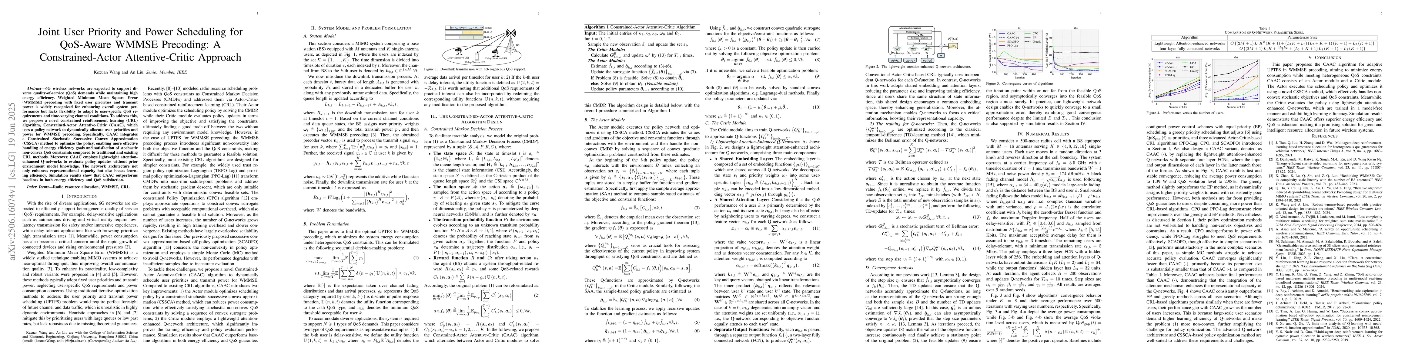 The paper introduces Constrained-Actor Attentive-Critic (CAAC), a reinforcement learning algorithm for 6G networks. CAAC dynamically allocates user priorities and power in WMMSE precoding, enhancing energy efficiency and QoS satisfaction, outperforming traditional methods in simulations.