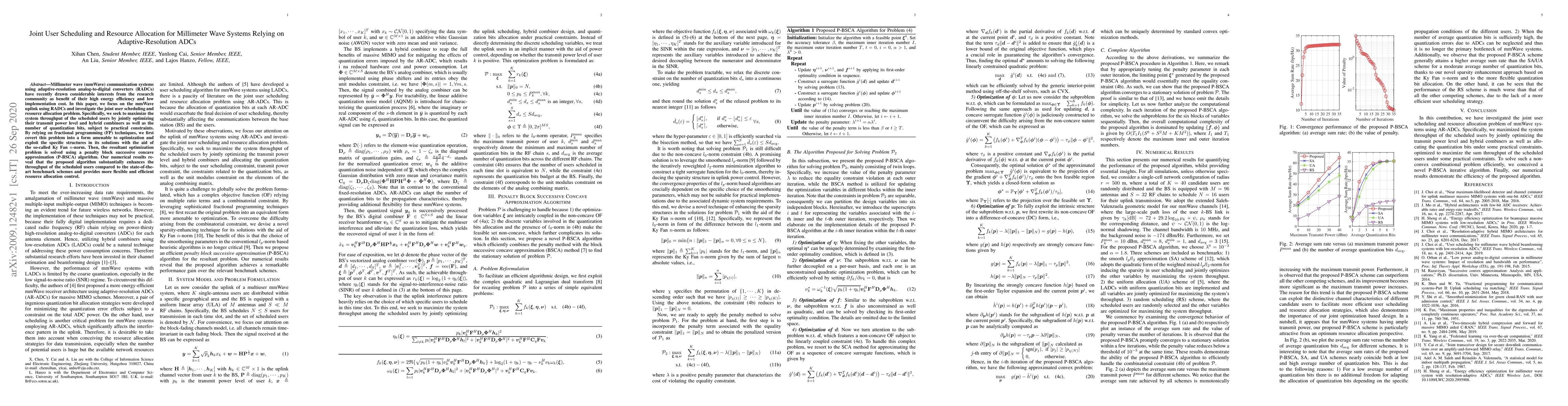 Millimeter wave (mmWave) communication systems using adaptive-resolution analog-to-digital converters (RADCs) have recently drawn considerable interests from the research community as benefit of their high energy efficiency and low implementation cost. In this paper, we focus on the mmWave uplink using RADCs and investigate the joint user scheduling and resource allocation problem. Specifically, we seek to maximize the system throughput of the scheduled users by jointly optimizing their transmit power level and hybrid combiners as well as the number of quantization bits, subject to practical constraints. By relying on fractional programming (FP) techniques, we first covert this problem into a form amenable to optimization and exploit the specific structures in its solutions with the aid of the so-called Ky Fan n-norm. Then, the resultant optimization problem is solved using a penalty block successive concave approximation (P-BSCA) algorithm. Our numerical results reveal that the proposed algorithm substantially enhances the throughput of the scheduled users compared to the state-of-theart benchmark schemes and provides more flexible and efficient resource allocation control.