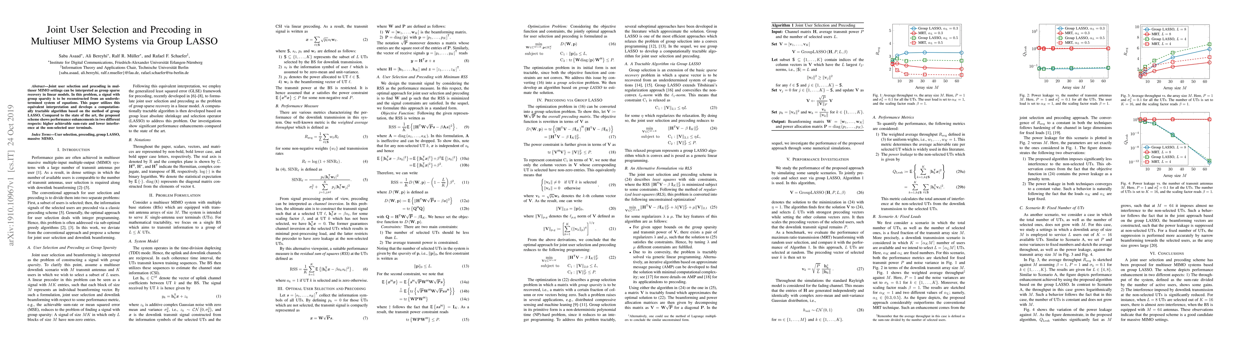 This paper proposes a joint user selection and precoding algorithm for multiuser MIMO systems using group LASSO, achieving higher sum-rate and reduced interference compared to existing methods. The approach interprets the problem as group sparse recovery in linear models.