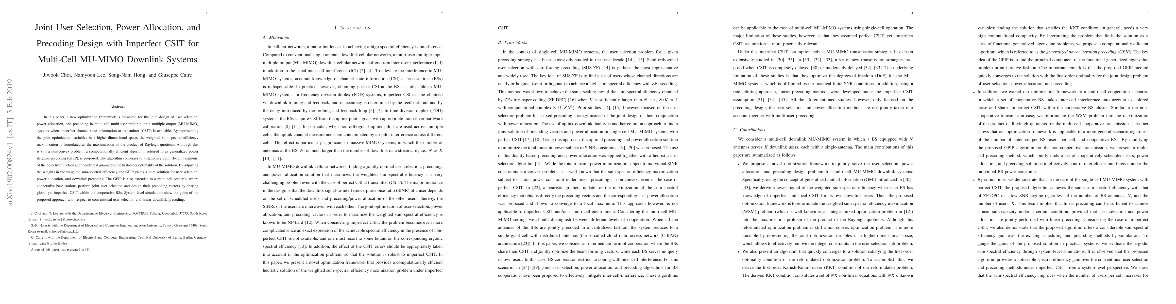 This paper presents an optimization framework for multi-cell MU-MIMO downlink systems with imperfect CSIT, jointly designing user selection, power allocation, and precoding. The proposed generalized power iteration precoding (GPIP) algorithm achieves first-order optimality and extends to a multi-cell scenario with cooperative base stations sharing global yet imperfect CSIT.