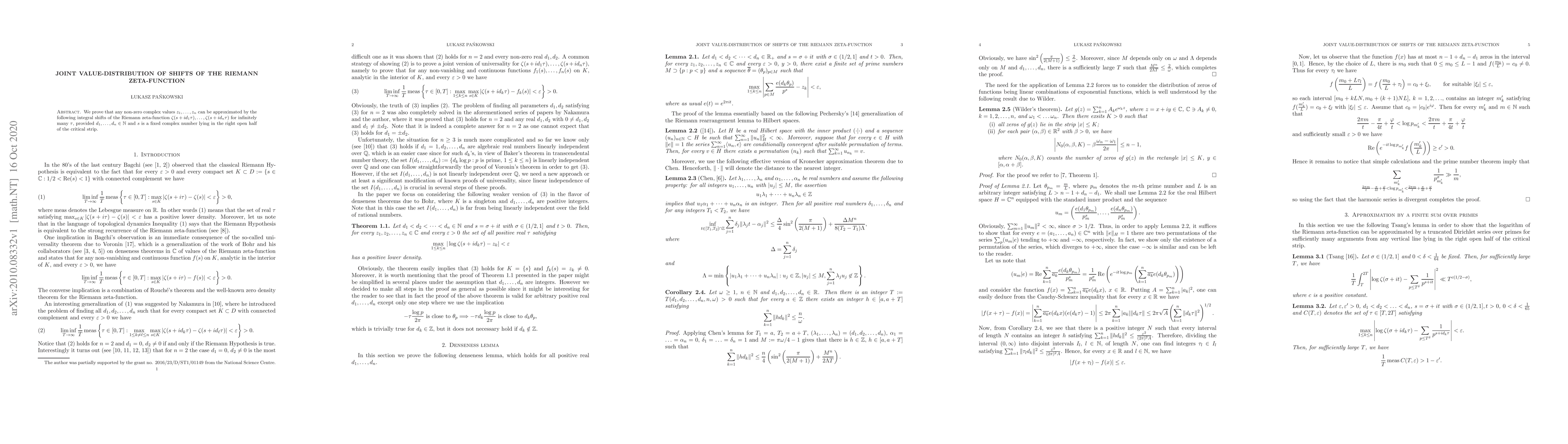 We prove that any non-zero complex values $z_1,\ldots,z_n$ can be approximated by the following integral shifts of the Riemann zeta-function $\zeta(s+id_1\tau),\ldots,\zeta(s+id_n\tau)$ for infinitely many $\tau$, provided $d_1,\ldots,d_n\in\mathbb{N}$ and $s$ is a fixed complex number lying in the right open half of the critical strip.