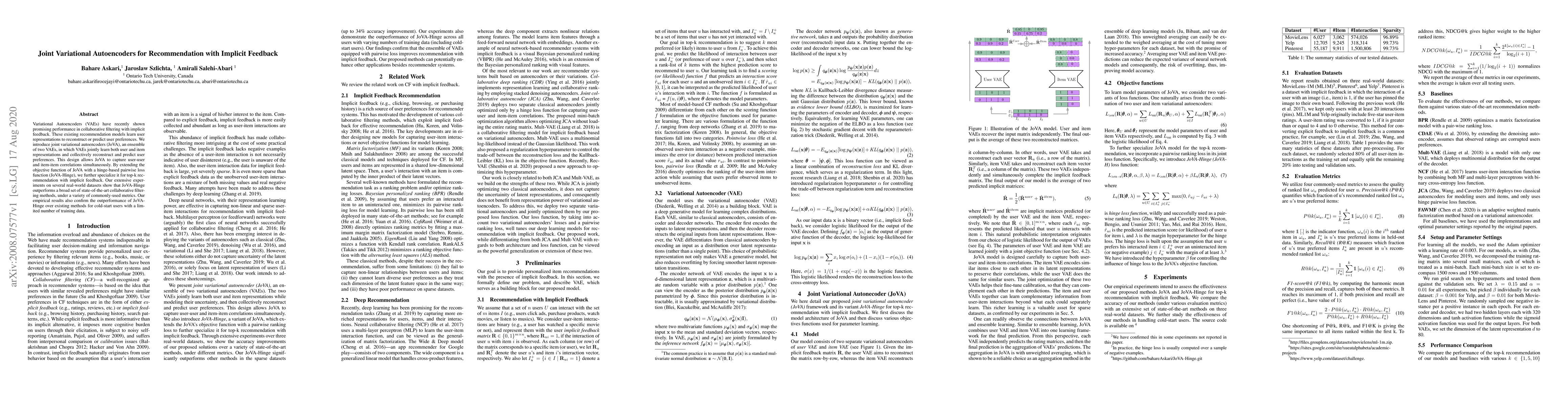 The paper proposes joint variational autoencoders (JoVA) for recommendation with implicit feedback, which use an ensemble of two VAEs to jointly learn user and item representations. JoVA-Hinge, an extension with a hinge-based loss function, outperforms state-of-the-art methods in top-k recommendation, especially for cold-start users.