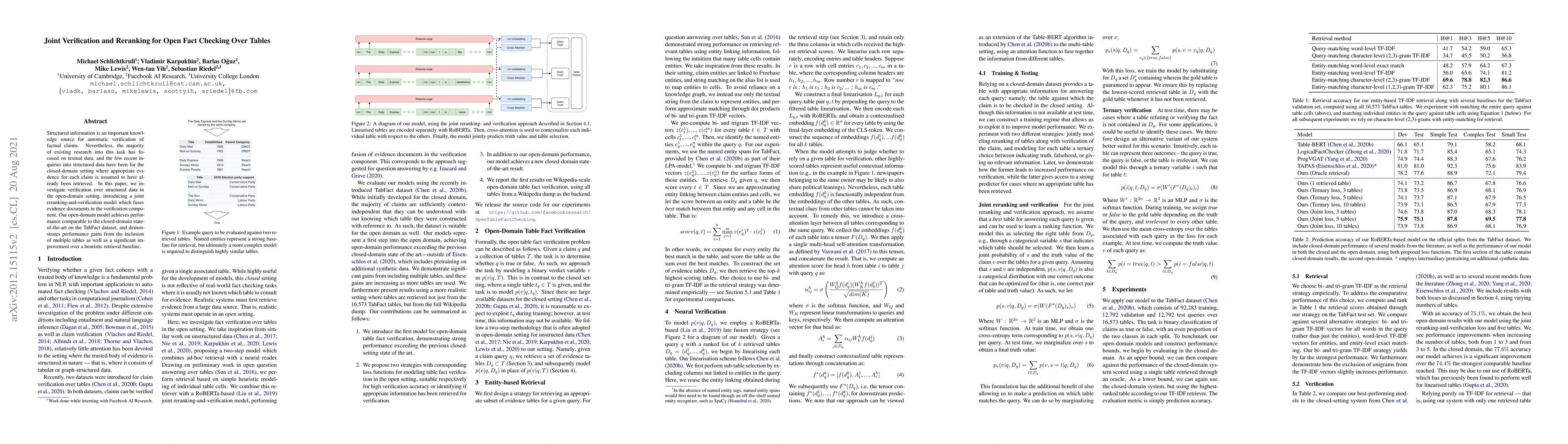 This paper proposes a joint verification and reranking model for open-domain fact checking over tables, achieving performance comparable to closed-domain methods on the TabFact dataset. The model demonstrates gains from using multiple tables and outperforms a heuristic retrieval baseline.