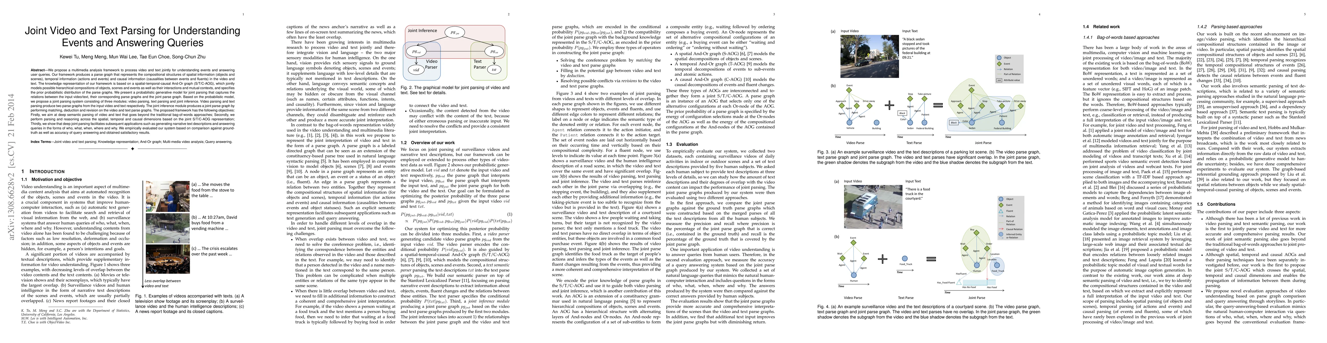 This paper proposes a framework for joint video and text parsing to understand events and answer queries by generating a parse graph representing spatial, temporal, and causal information. The framework uses a spatial-temporal-causal And-Or graph (S/T/C-AOG) for deep semantic parsing, and a probabilistic generative model for joint inference, achieving better query answering and narrative text generation.