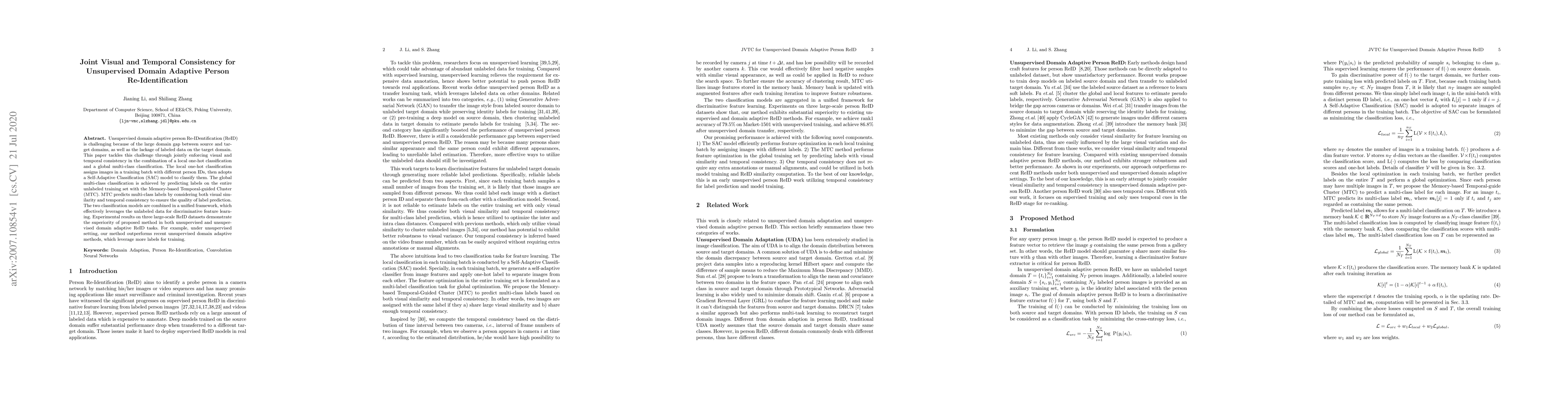 This paper proposes a method for unsupervised domain adaptive person re-identification by enforcing visual and temporal consistency through a combination of local one-hot and global multi-class classification, leveraging unlabeled data for discriminative feature learning. Experimental results show superior performance compared to recent methods on large-scale datasets.