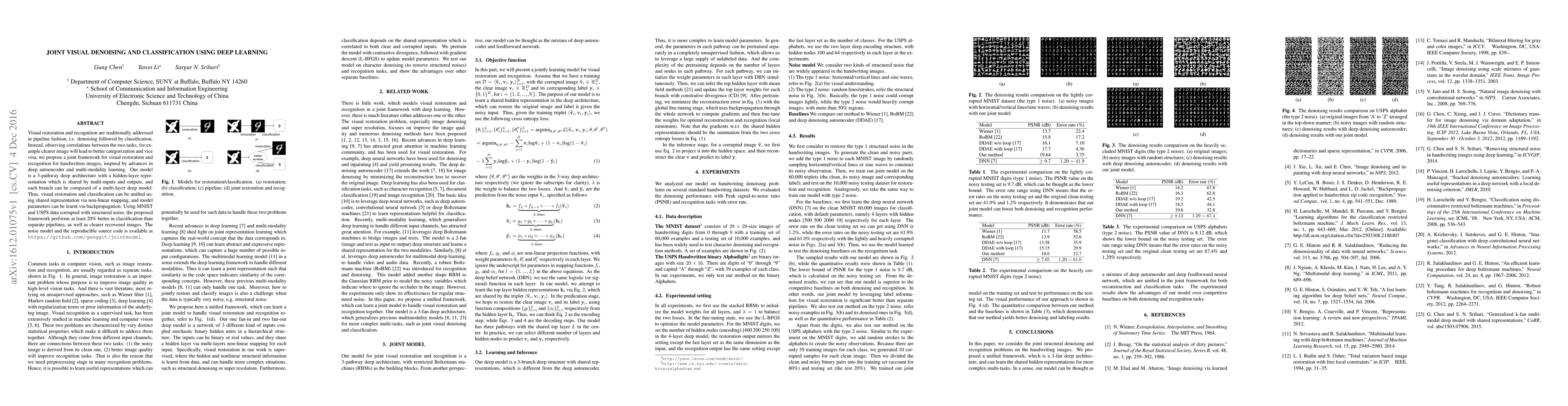Visual restoration and recognition are traditionally addressed in pipeline fashion, i.e. denoising followed by classification. Instead, observing correlations between the two tasks, for example clearer image will lead to better categorization and vice visa, we propose a joint framework for visual restoration and recognition for handwritten images, inspired by advances in deep autoencoder and multi-modality learning. Our model is a 3-pathway deep architecture with a hidden-layer representation which is shared by multi-inputs and outputs, and each branch can be composed of a multi-layer deep model. Thus, visual restoration and classification can be unified using shared representation via non-linear mapping, and model parameters can be learnt via backpropagation. Using MNIST and USPS data corrupted with structured noise, the proposed framework performs at least 20\% better in classification than separate pipelines, as well as clearer recovered images. The noise model and the reproducible source code is available at {\url{https://github.com/ganggit/jointmodel}}.