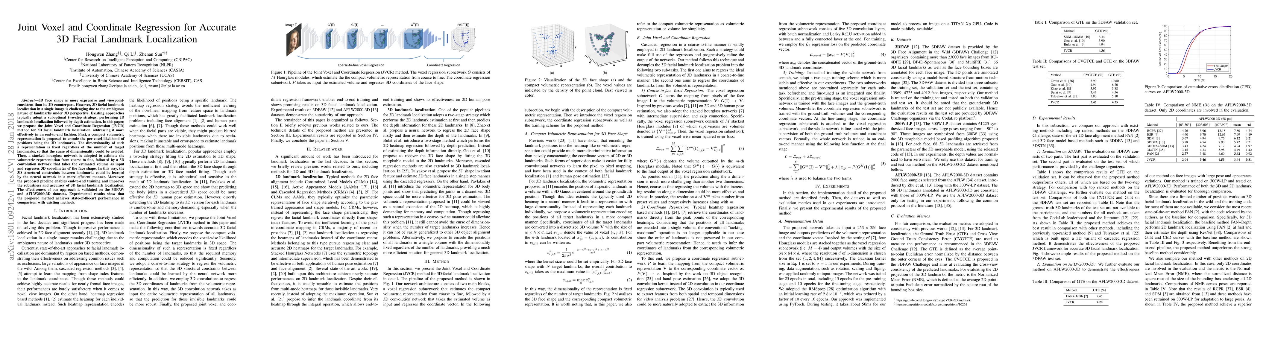This paper proposes the Joint Voxel and Coordinate Regression (JVCR) method for accurate 3D facial landmark localization, addressing the challenge of ambiguous 3D perspective. The method uses a compact volumetric representation and a stacked hourglass network to achieve end-to-end training, improving robustness and accuracy over existing two-step strategies.