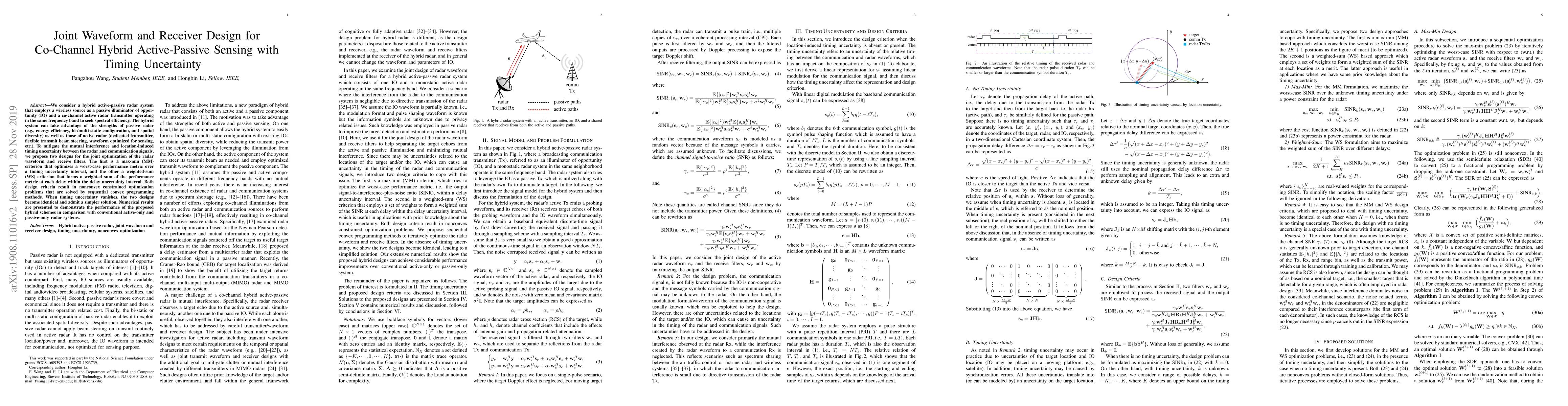 This paper proposes joint waveform and receiver design for a hybrid active-passive radar system operating in co-channel with timing uncertainty. It introduces two optimization criteria to mitigate interference: max-min and weighted-sum, solved using convex programming, and demonstrates their performance against conventional radar systems.