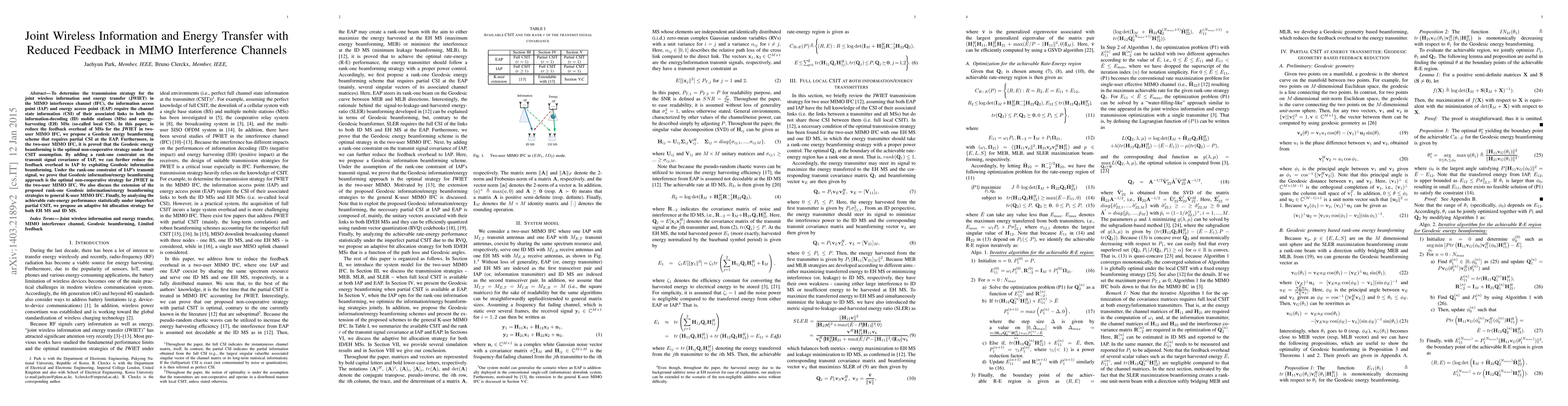 This paper proposes a Geodesic energy beamforming scheme to optimize joint wireless information and energy transfer (JWIET) in MIMO interference channels, reducing feedback overhead by requiring only partial channel state information (CSI) at the energy access point. The scheme is shown to be optimal for two-user MIMO IFC and can be extended to K-user scenarios, with an adaptive bit allocation strategy under imperfect CSI.