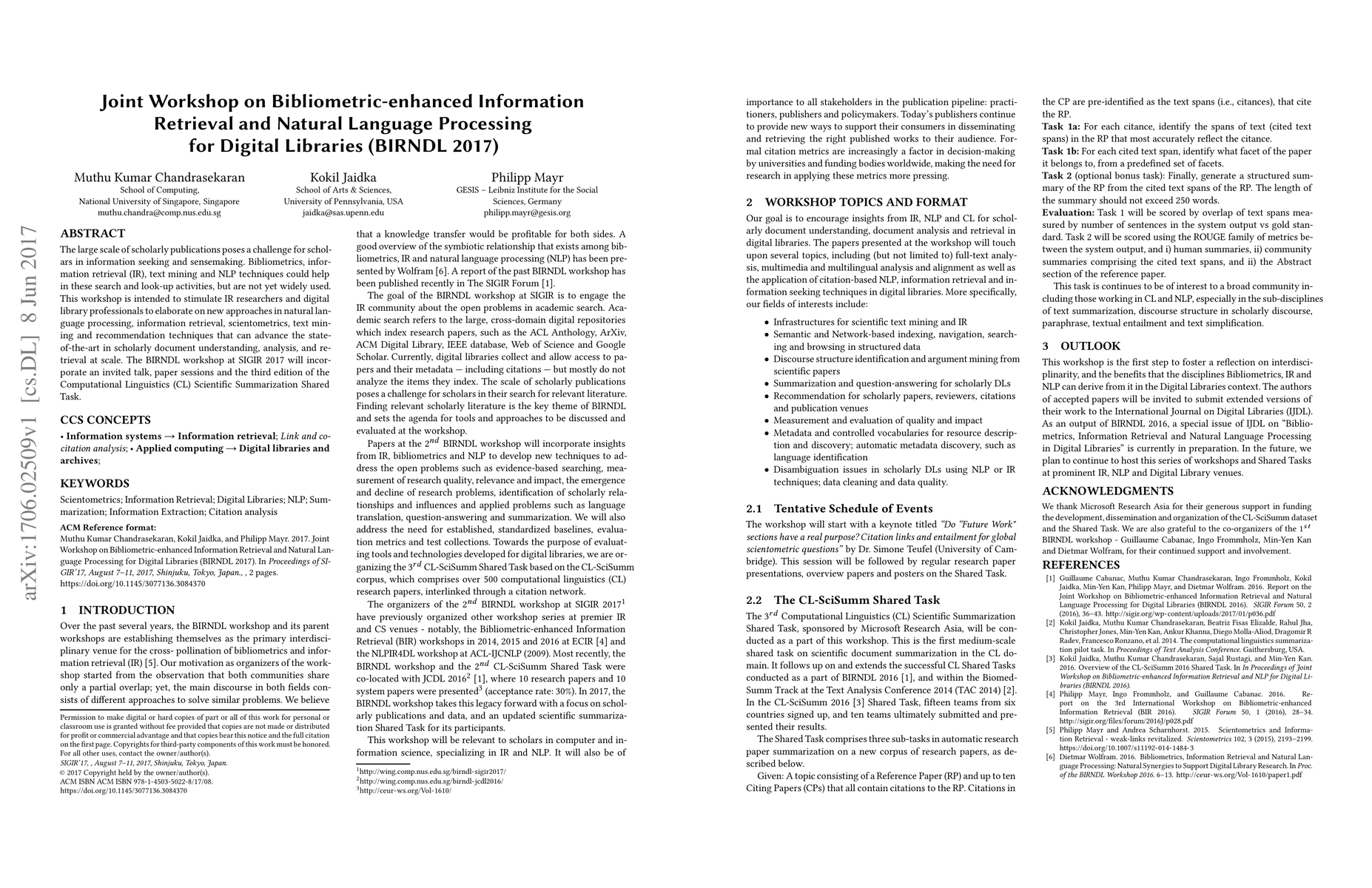 The BIRNDL 2017 workshop aims to advance scholarly document understanding and retrieval through the integration of bibliometric, IR, NLP, and text mining techniques. It includes discussions on new approaches to improve large-scale information seeking and analysis in digital libraries.