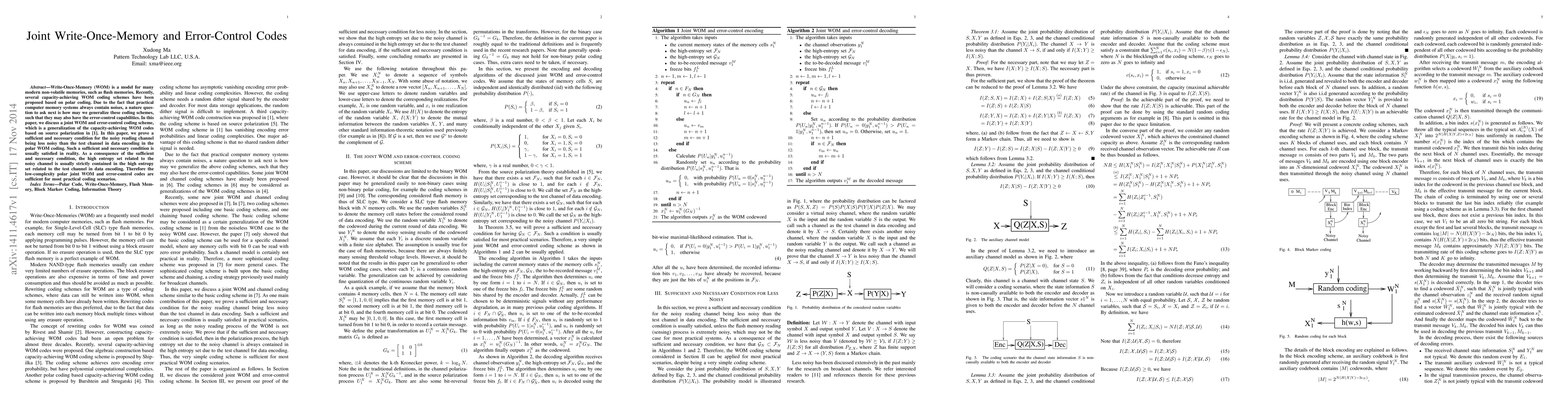 This paper proposes a joint Write-Once-Memory (WOM) and error-control coding scheme based on polar coding, proving a sufficient and necessary condition for the noisy reading channel to be less noisy than the test channel, ensuring practical applicability. The scheme effectively generalizes capacity-achieving WOM codes to include error-control capabilities.