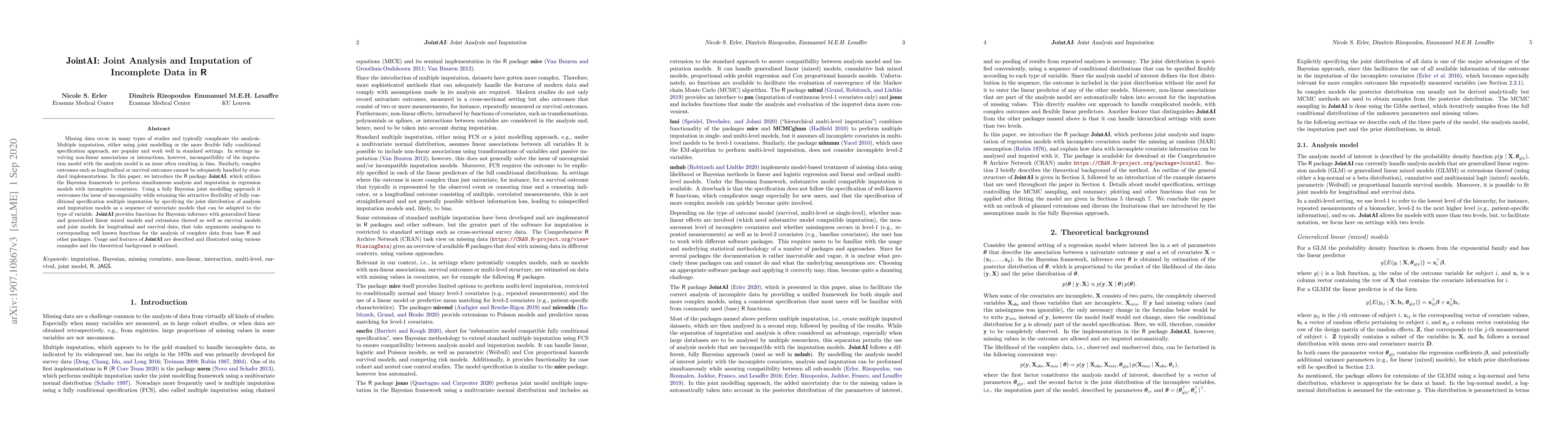 The R package JointAI addresses the challenge of incomplete data by performing simultaneous analysis and imputation using a fully Bayesian joint modelling approach, which effectively handles non-linear associations and complex outcomes like longitudinal or survival data, thereby reducing bias compared to standard methods. JointAI provides flexible functions for Bayesian inference in generalized linear and mixed models, as well as survival models.