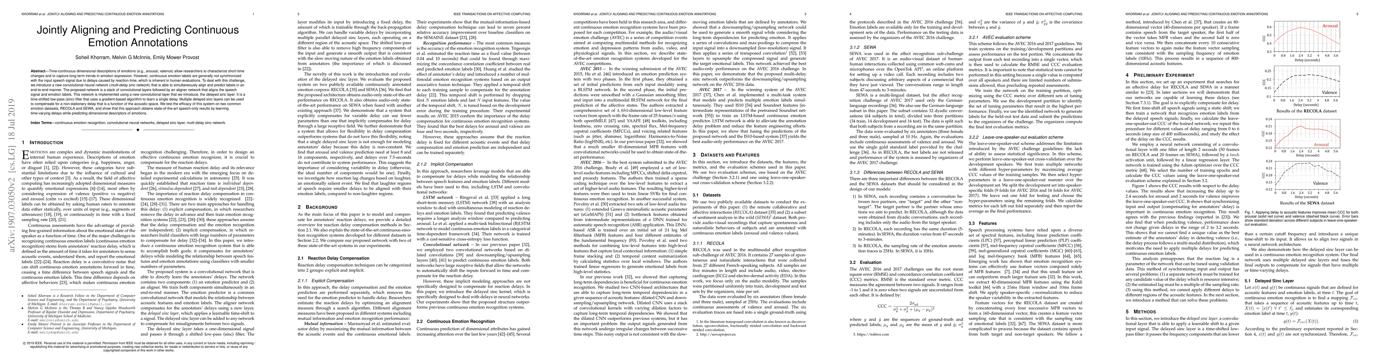 A new convolutional neural network predicts continuous emotion annotations while simultaneously aligning them with input speech signals, achieving state-of-the-art results in two common emotion datasets.