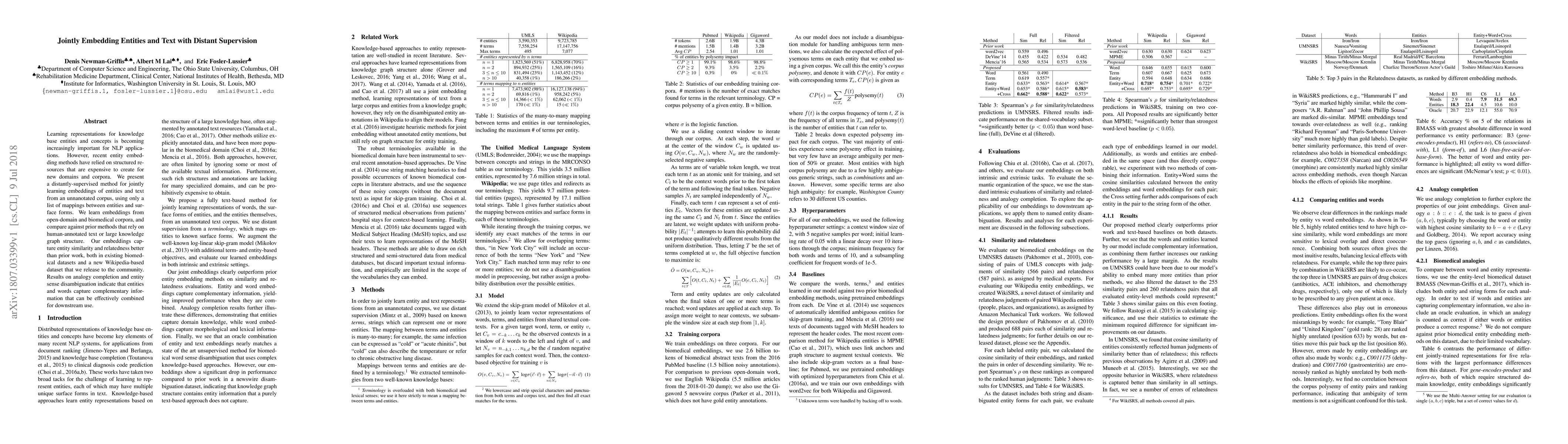 This paper proposes a distantly-supervised method for jointly embedding knowledge base entities and text from an unannotated corpus using only entity-surface form mappings. The approach outperforms prior methods reliant on human-annotated data or large knowledge graphs, demonstrating better entity similarity and relatedness in biomedical and Wikipedia-based datasets.