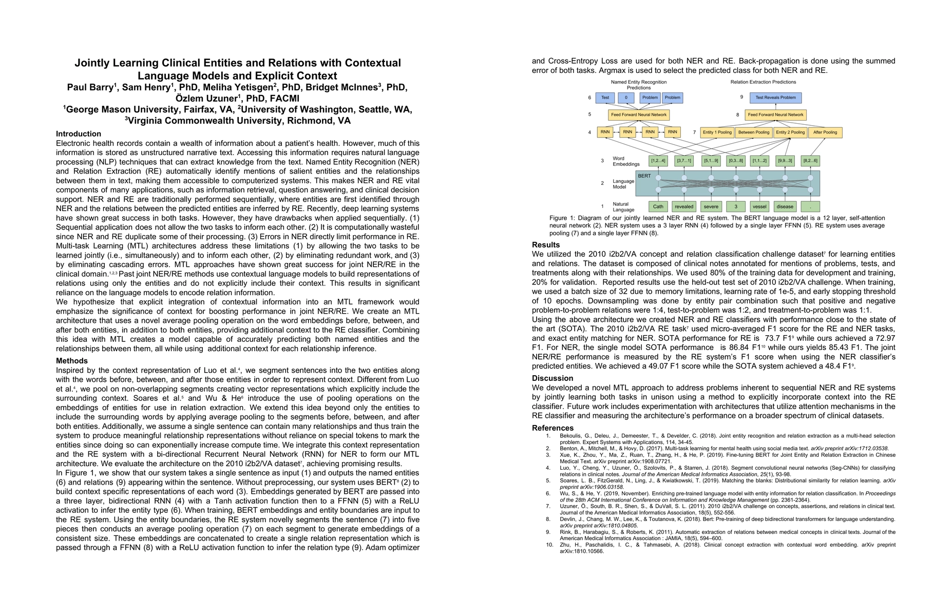This paper proposes a multi-task learning framework that integrates explicit contextual information to enhance Named Entity Recognition (NER) and Relation Extraction (RE). The approach segments entities from context and builds contextual representations, achieving near state-of-the-art performance on both tasks, notably surpassing existing RE systems.