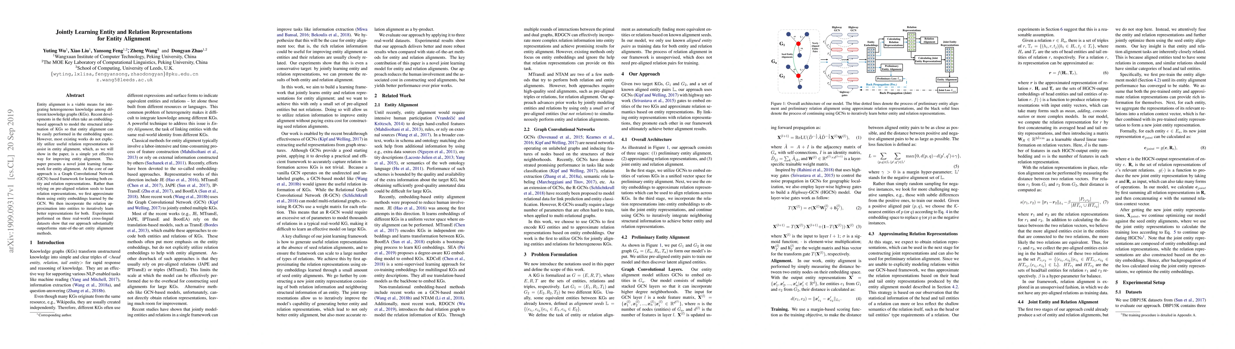 This paper proposes a joint learning framework using Graph Convolutional Networks to simultaneously learn entity and relation representations for entity alignment, demonstrating improved performance over state-of-the-art methods on cross-lingual datasets.