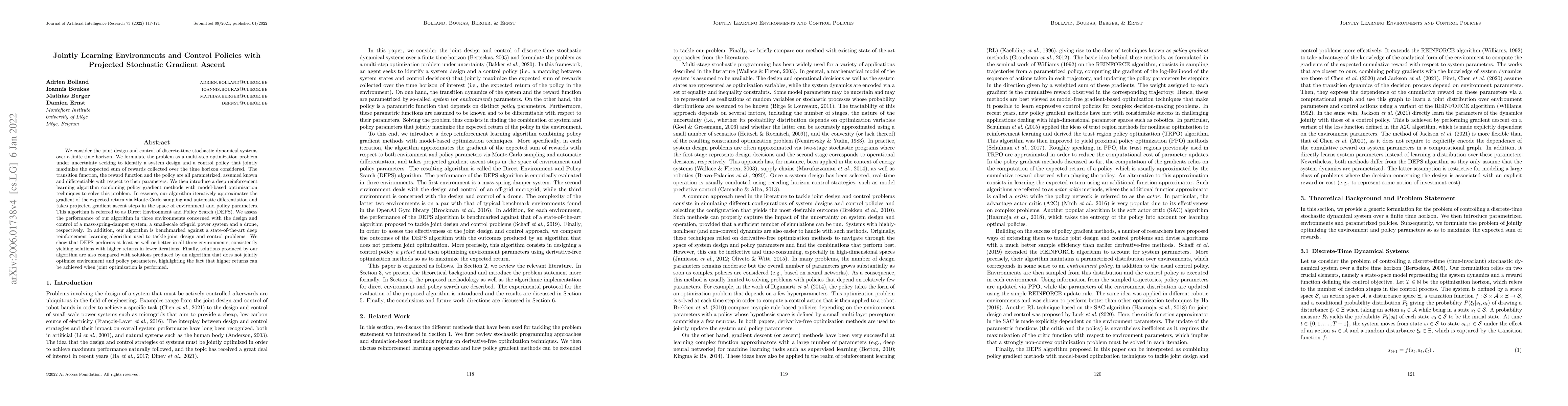 A new algorithm called Direct Environment and Policy Search (DEPS) jointly learns environment design and control policies using projected stochastic gradient ascent, outperforming a state-of-the-art algorithm in three environments with higher returns in fewer iterations.