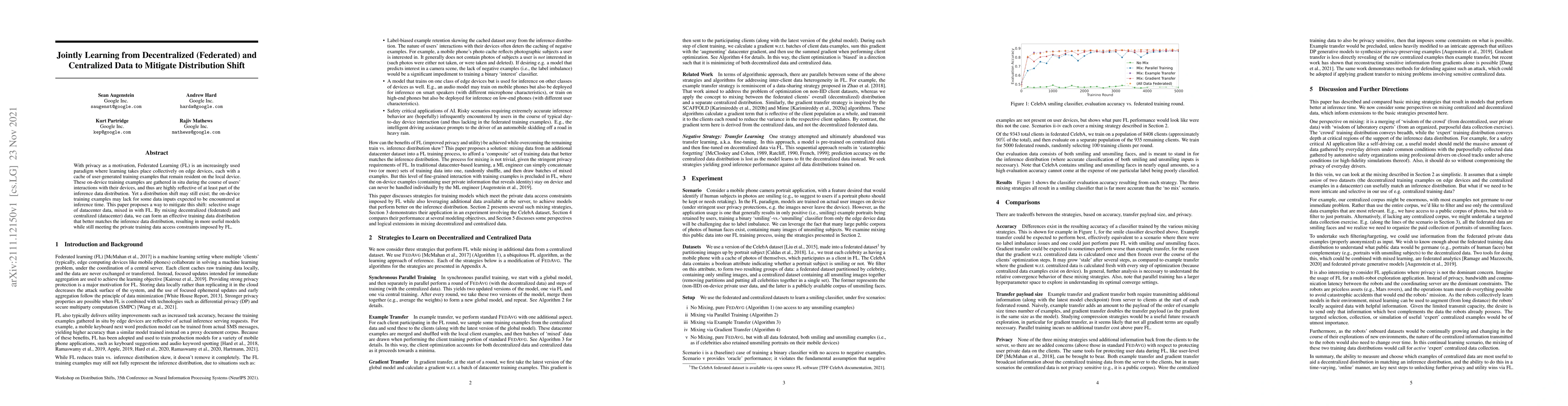 This research introduces a method to enhance Federated Learning (FL) models by incorporating datacenter data, addressing distribution shift issues. The approach maintains privacy as it uses on-device training examples, while improving model utility through a mixed training data distribution that better aligns with inference data.