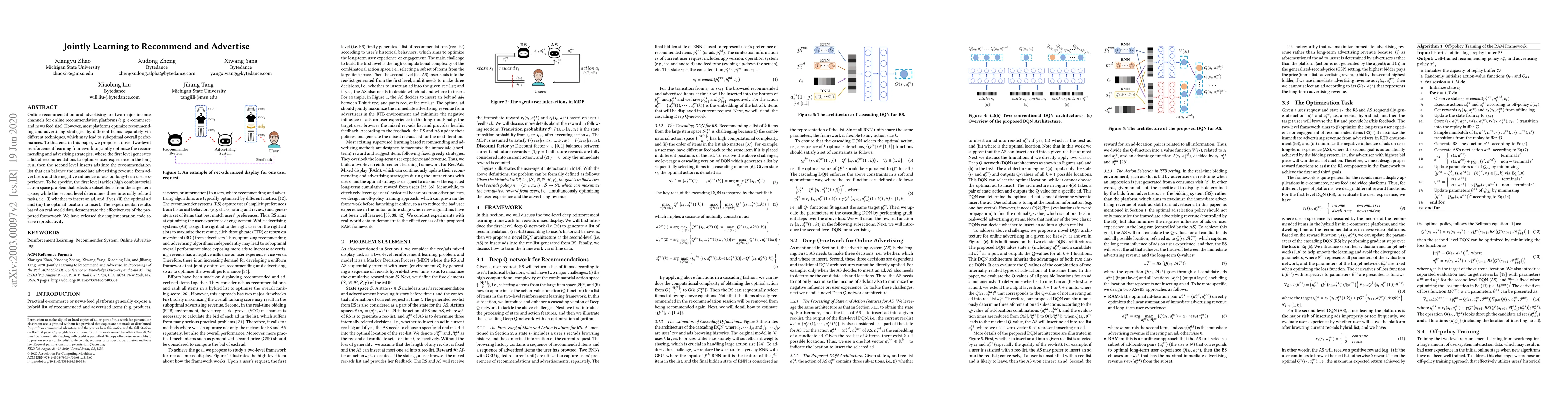 Online recommendation and advertising are two major income channels for online recommendation platforms (e.g. e-commerce and news feed site). However, most platforms optimize recommending and advertising strategies by different teams separately via different techniques, which may lead to suboptimal overall performances. To this end, in this paper, we propose a novel two-level reinforcement learning framework to jointly optimize the recommending and advertising strategies, where the first level generates a list of recommendations to optimize user experience in the long run; then the second level inserts ads into the recommendation list that can balance the immediate advertising revenue from advertisers and the negative influence of ads on long-term user experience. To be specific, the first level tackles high combinatorial action space problem that selects a subset items from the large item space; while the second level determines three internally related tasks, i.e., (i) whether to insert an ad, and if yes, (ii) the optimal ad and (iii) the optimal location to insert. The experimental results based on real-world data demonstrate the effectiveness of the proposed framework. We have released the implementation code to ease reproductivity.