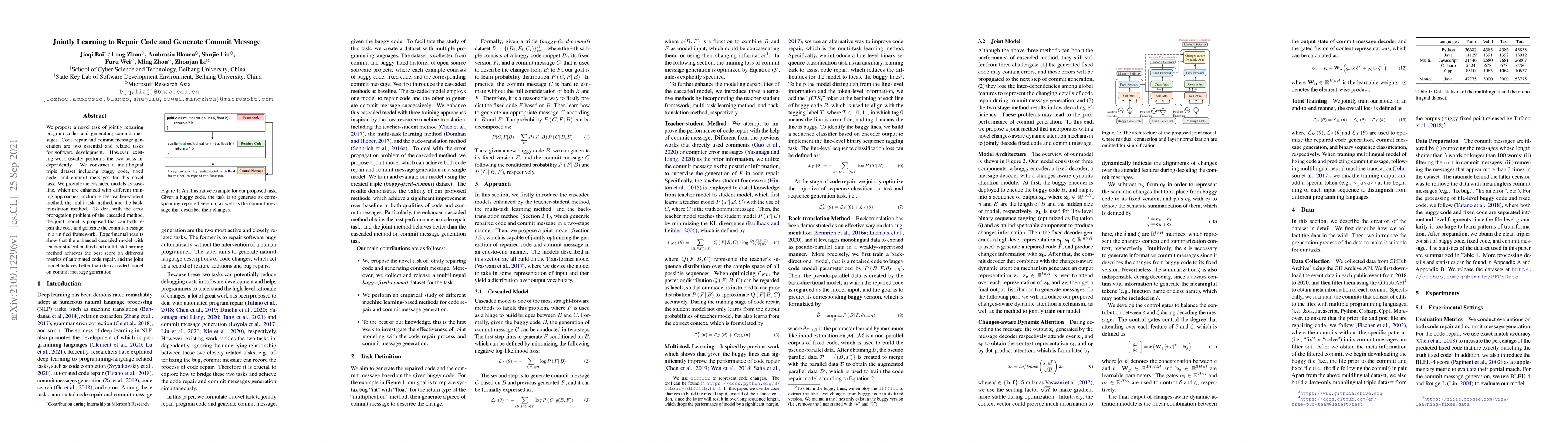 This paper introduces a novel task of jointly repairing code and generating commit messages, proposing a multilingual triple dataset and enhanced cascaded models. The joint model, which repairs code and generates commit messages in a unified framework, outperforms the cascaded model in commit message generation, while the enhanced cascaded model achieves better code repair results.