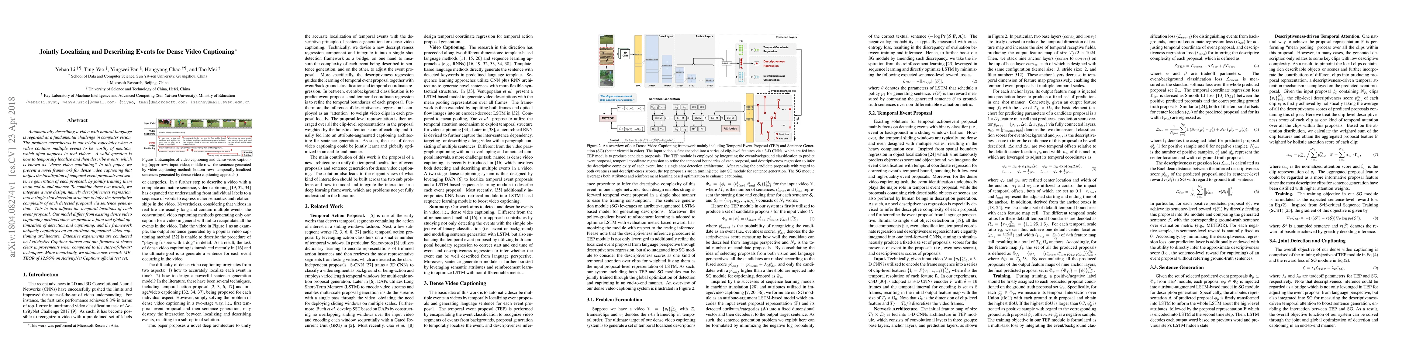Automatically describing a video with natural language is regarded as a fundamental challenge in computer vision. The problem nevertheless is not trivial especially when a video contains multiple events to be worthy of mention, which often happens in real videos. A valid question is how to temporally localize and then describe events, which is known as "dense video captioning." In this paper, we present a novel framework for dense video captioning that unifies the localization of temporal event proposals and sentence generation of each proposal, by jointly training them in an end-to-end manner. To combine these two worlds, we integrate a new design, namely descriptiveness regression, into a single shot detection structure to infer the descriptive complexity of each detected proposal via sentence generation. This in turn adjusts the temporal locations of each event proposal. Our model differs from existing dense video captioning methods since we propose a joint and global optimization of detection and captioning, and the framework uniquely capitalizes on an attribute-augmented video captioning architecture. Extensive experiments are conducted on ActivityNet Captions dataset and our framework shows clear improvements when compared to the state-of-the-art techniques. More remarkably, we obtain a new record: METEOR of 12.96% on ActivityNet Captions official test set.