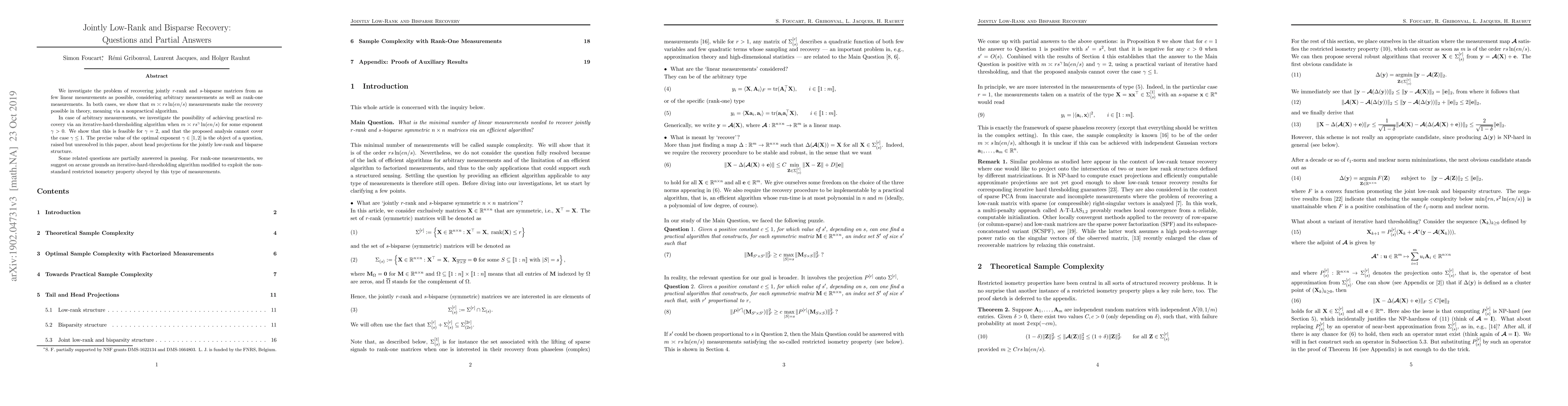 We investigate the problem of recovering jointly $r$-rank and $s$-bisparse matrices from as few linear measurements as possible, considering arbitrary measurements as well as rank-one measurements. In both cases, we show that $m \asymp r s \ln(en/s)$ measurements make the recovery possible in theory, meaning via a nonpractical algorithm. In case of arbitrary measurements, we investigate the possibility of achieving practical recovery via an iterative-hard-thresholding algorithm when $m \asymp r s^\gamma \ln(en/s)$ for some exponent $\gamma > 0$. We show that this is feasible for $\gamma = 2$, and that the proposed analysis cannot cover the case $\gamma \leq 1$. The precise value of the optimal exponent $\gamma \in [1,2]$ is the object of a question, raised but unresolved in this paper, about head projections for the jointly low-rank and bisparse structure. Some related questions are partially answered in passing. For rank-one measurements, we suggest on arcane grounds an iterative-hard-thresholding algorithm modified to exploit the nonstandard restricted isometry property obeyed by this type of measurements.