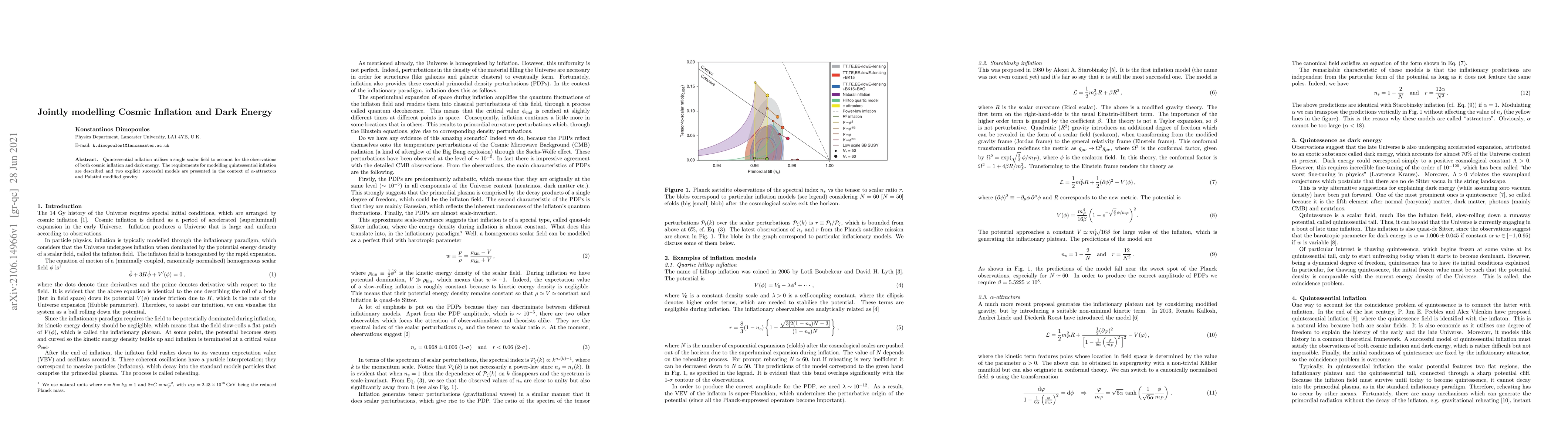 Quintessential inflation utilises a single scalar field to account for the observations of both cosmic inflation and dark energy. The requirements for modelling quintessential inflation are described and two explicit successful models are presented in the context of $\alpha$-attractors and Palatini modified gravity.