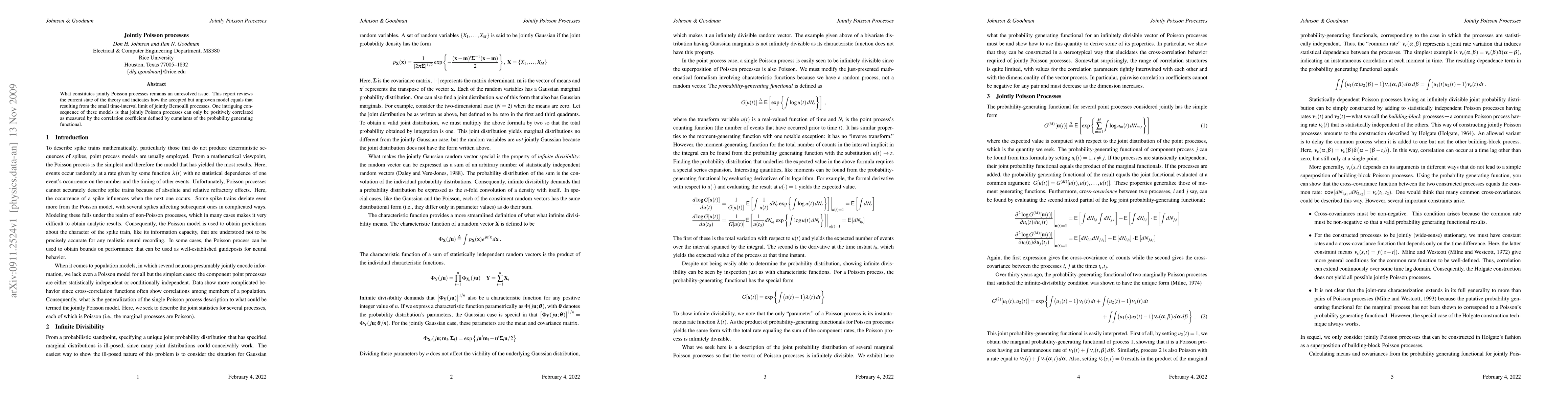 This paper explores jointly Poisson processes, finding they can only be positively correlated, with a correlation coefficient defined by cumulants of the probability generating functional.