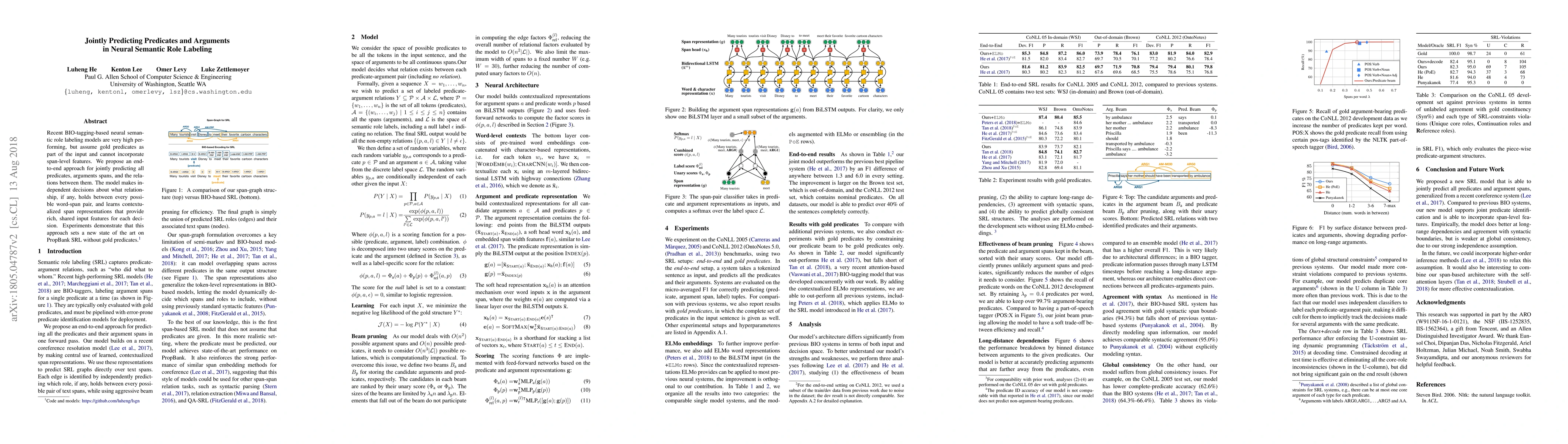The paper proposes an end-to-end neural model for jointly predicting predicates, argument spans, and their relationships in semantic role labeling, achieving state-of-the-art results on the PropBank SRL task without requiring gold predicates in input. The model uses contextualized span representations to provide rich features for relationship predictions between word-span pairs.