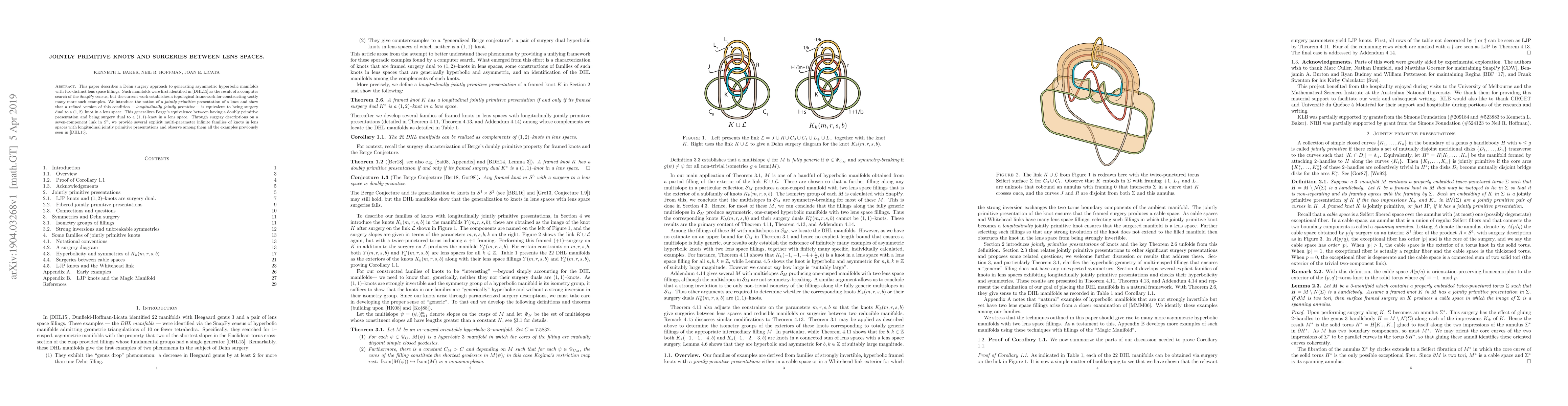 This paper describes a Dehn surgery approach to generating asymmetric hyperbolic manifolds with two distinct lens space fillings. Such manifolds were first identified in work of Dunfield-Hoffman-Licata as the result of a computer search of the SnapPy census, but the current work establishes a topological framework for constructing vastly many more such examples. We introduce the notion of a ``jointly primitive'' presentation of a knot and show that a refined version of this condition ``longitudinally jointly primitive'' is equivalent to being surgery dual to a $(1,2)$--knot in a lens space. This generalizes Berge's equivalence between having a doubly primitive presentation and being surgery dual to a $(1,1)$--knot in a lens space. Through surgery descriptions on a seven-component link in $S^3$, we provide several explicit multi-parameter infinite families of knots in lens spaces with longitudinal jointly primitive presentations and observe among them all the examples previously seen in Dunfield-Hoffman-Licata.