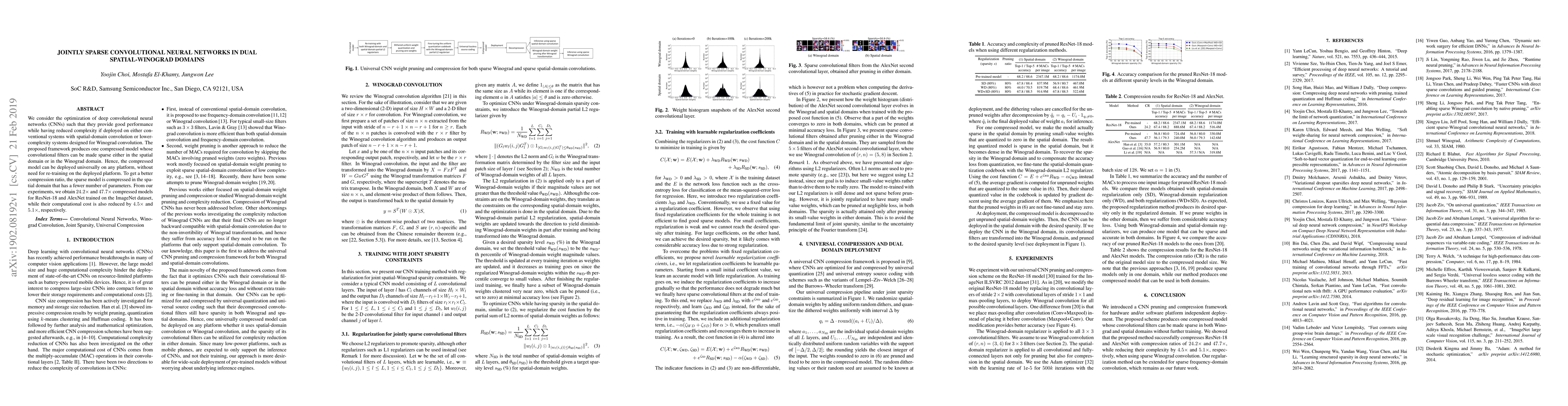 This paper proposes a framework for jointly sparse convolutional neural networks optimized for both spatial-domain and Winograd convolution, achieving significant model compression and reduced computational cost without requiring re-training. Experimental results show up to 24.2× and 47.7× compression for ResNet-18 and AlexNet on ImageNet, with a 4.5× and 5.1× reduction in computational cost, respectively.
