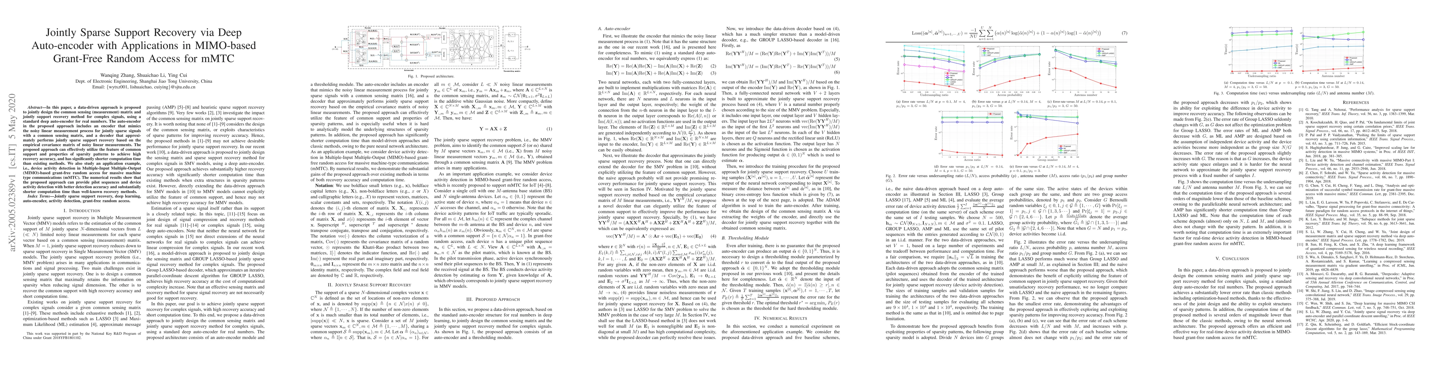 This paper proposes a data-driven deep auto-encoder method for jointly sparse support recovery, achieving high accuracy and shorter computation time. It applies this approach to device activity detection in MIMO-based grant-free random access for massive machine type communications, demonstrating improved detection accuracy and efficiency.