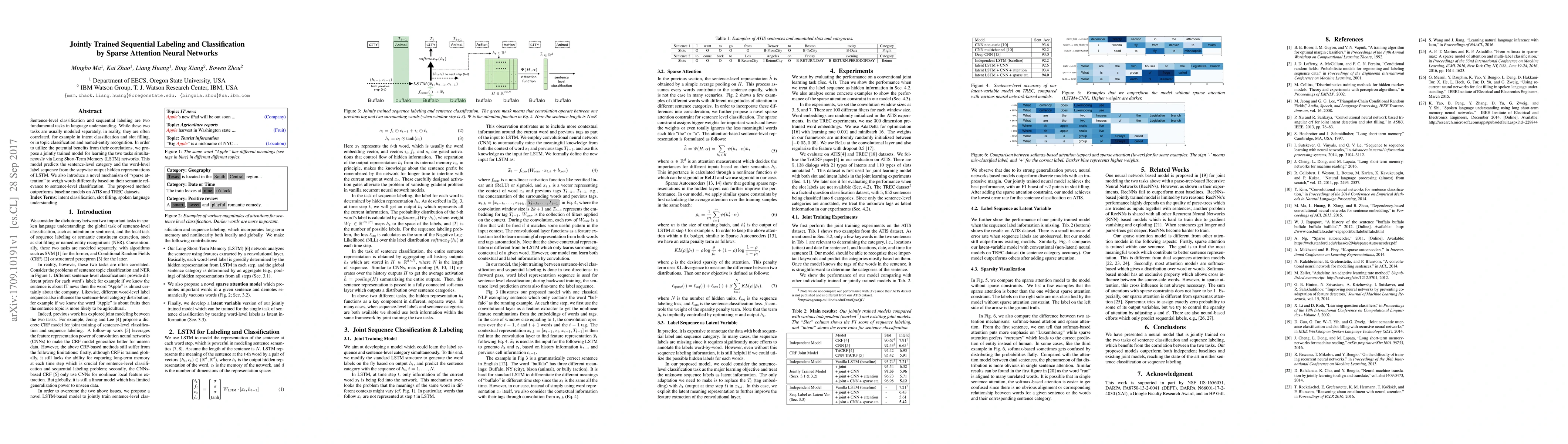 This paper proposes a jointly trained model using sparse attention neural networks to simultaneously perform sentence-level classification and sequential labeling tasks, leveraging correlations between them. The model utilizes LSTM networks and outperforms baselines on ATIS and TREC datasets.