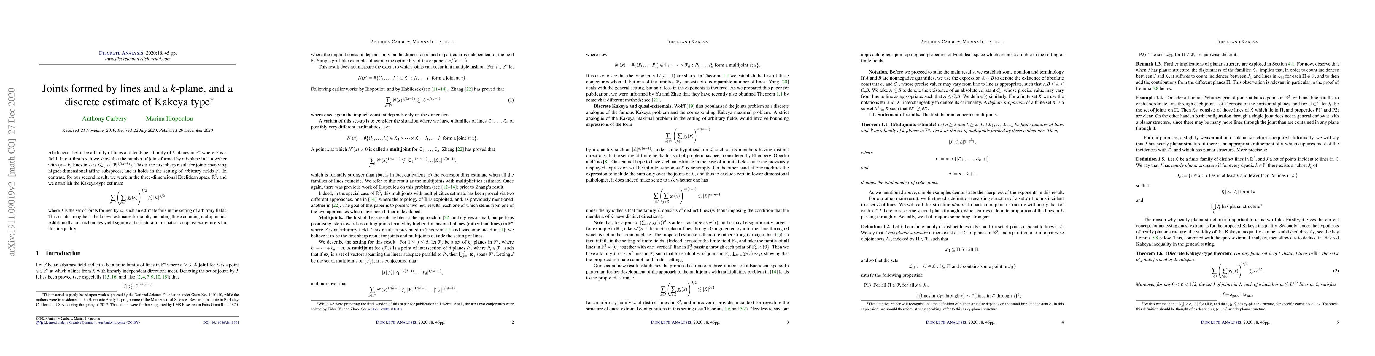 Let $\mathcal{L}$ be a family of lines and let $\mathcal{P}$ be a family of $k$-planes in $\mathbb{F}^n$ where $\mathbb{F}$ is a field. In our first result we show that the number of joints formed by a $k$-plane in $\mathcal{P}$ together with $(n-k)$ lines in $\mathcal{L}$ is $O_n(|\mathcal{L}||\mathcal{P}|^{1/(n-k)}$). This is the first sharp result for joints involving higher-dimensional affine subspaces, and it holds in the setting of arbitrary fields $\mathbb{F}$. In contrast, for our second result, we work in the three-dimensional Euclidean space $\mathbb{R}^3$, and we establish the Kakeya-type estimate \begin{equation*}\sum_{x \in J} \left(\sum_{\ell \in \mathcal{L}} \chi_\ell(x)\right)^{3/2} \lesssim |\mathcal{L}|^{3/2}\end{equation*} where $J$ is the set of joints formed by $\mathcal{L}$; such an estimate fails in the setting of arbitrary fields. This result strengthens the known estimates for joints, including those counting multiplicities. Additionally, our techniques yield significant structural information on quasi-extremisers for this inequality.