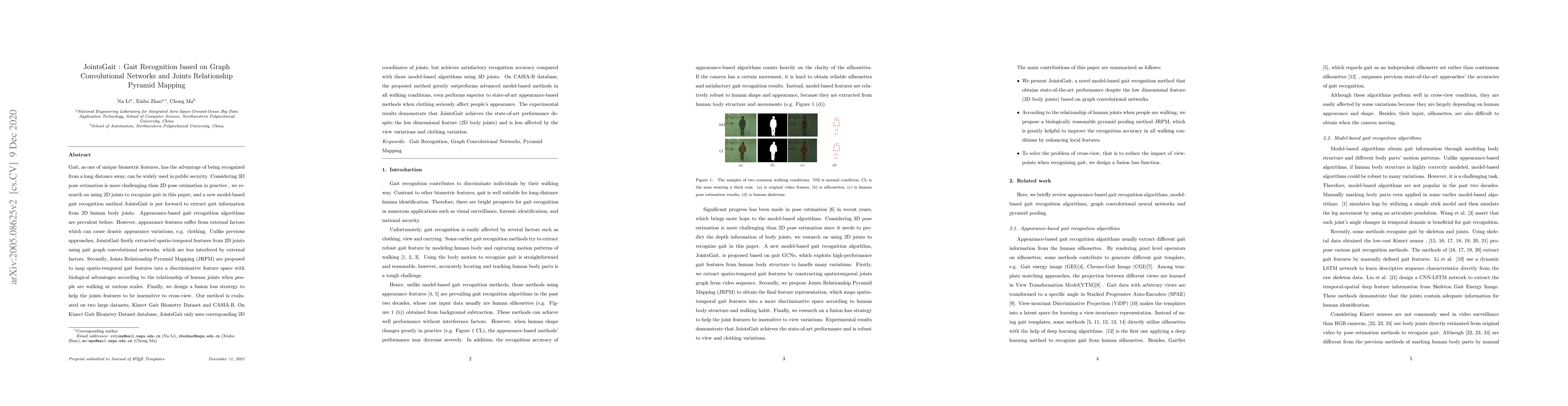 Gait, as one of unique biometric features, has the advantage of being recognized from a long distance away, can be widely used in public security. Considering 3D pose estimation is more challenging than 2D pose estimation in practice , we research on using 2D joints to recognize gait in this paper, and a new model-based gait recognition method JointsGait is put forward to extract gait information from 2D human body joints. Appearance-based gait recognition algorithms are prevalent before. However, appearance features suffer from external factors which can cause drastic appearance variations, e.g. clothing. Unlike previous approaches, JointsGait firstly extracted spatio-temporal features from 2D joints using gait graph convolutional networks, which are less interfered by external factors. Secondly, Joints Relationship Pyramid Mapping (JRPM) are proposed to map spatio-temporal gait features into a discriminative feature space with biological advantages according to the relationship of human joints when people are walking at various scales. Finally, we design a fusion loss strategy to help the joints features to be insensitive to cross-view. Our method is evaluated on two large datasets, Kinect Gait Biometry Dataset and CASIA-B. On Kinect Gait Biometry Dataset database, JointsGait only uses corresponding 2D coordinates of joints, but achieves satisfactory recognition accuracy compared with those model-based algorithms using 3D joints. On CASIA-B database, the proposed method greatly outperforms advanced model-based methods in all walking conditions, even performs superior to state-of-art appearance-based methods when clothing seriously affect people's appearance. The experimental results demonstrate that JointsGait achieves the state-of-art performance despite the low dimensional feature (2D body joints) and is less affected by the view variations and clothing variation.