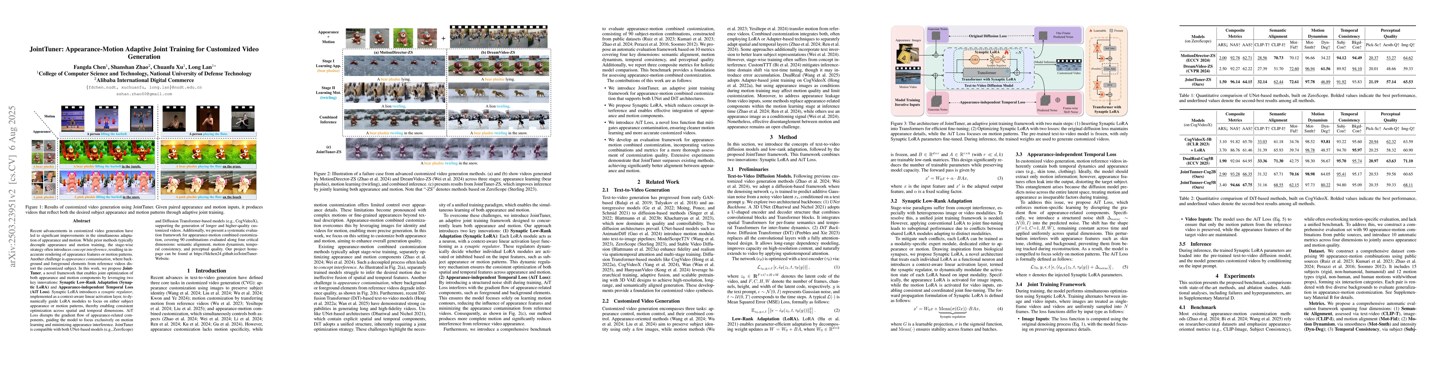 Recent advancements in customized video generation have led to significant improvements in the simultaneous adaptation of appearance and motion. While prior methods typically decouple appearance and motion training, the stage-wise strategy often introduces concept interference, resulting in inaccurate rendering of appearance features or motion patterns. Another challenge is appearance contamination, where background and foreground elements from reference videos distort the customized subject. In this work, we propose JointTuner, a novel framework that enables joint optimization of both appearance and motion components by leveraging two key innovations: Synaptic Low-Rank Adaptation (Synaptic LoRA) and Appearance-independent Temporal Loss (AiT Loss). Synaptic LoRA introduces a synaptic regulator, implemented as a context-aware linear activation layer, to dynamically guide LoRA modules to focus on either subject appearance or motion patterns, thereby enabling consistent optimization across spatial and temporal dimensions. AiT Loss disrupts the gradient flow of appearance-related components, guiding the model to focus exclusively on motion learning and minimizing appearance interference. JointTuner is compatible with both UNet-based models (e.g., ZeroScope) and Diffusion Transformer-based models (e.g., CogVideoX), supporting the generation of longer and higher-quality customized videos. Additionally, we present a systematic evaluation framework for appearance-motion combined customization, covering 90 combinations evaluated along four critical dimensions: semantic alignment, motion dynamism, temporal consistency, and perceptual quality. Our project homepage can be found at https://fdchen24.github.io/JointTuner-Website.