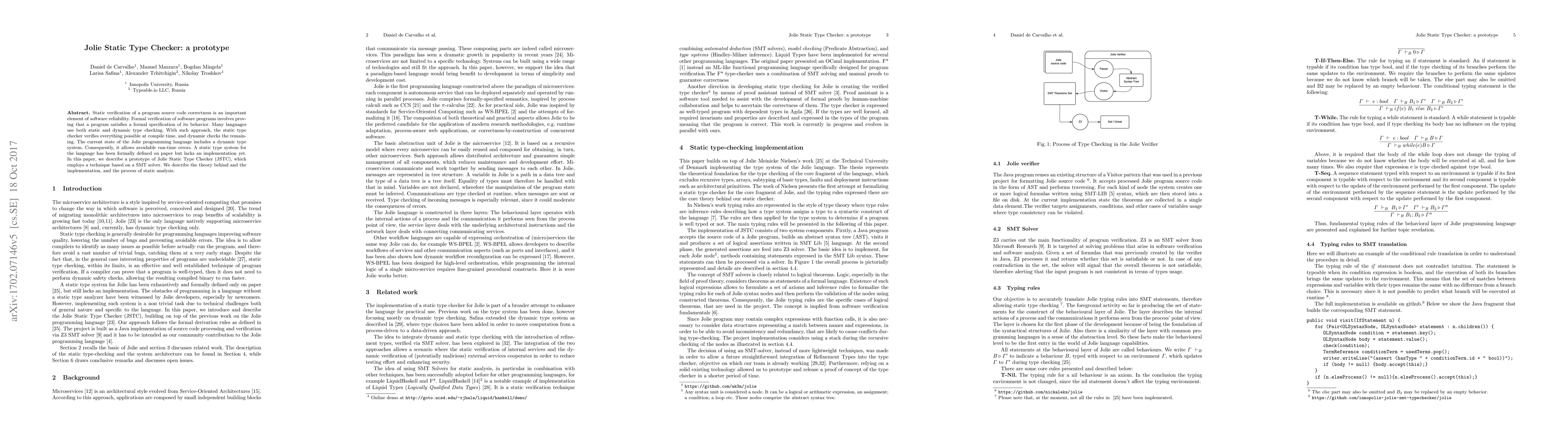 Static verification of a program source code correctness is an important element of software reliability. Formal verification of software programs involves proving that a program satisfies a formal specification of its behavior. Many languages use both static and dynamic type checking. With such approach, the static type checker verifies everything possible at compile time, and dynamic checks the remaining. The current state of the Jolie programming language includes a dynamic type system. Consequently, it allows avoidable run-time errors. A static type system for the language has been formally defined on paper but lacks an implementation yet. In this paper, we describe a prototype of Jolie Static Type Checker (JSTC), which employs a technique based on a SMT solver. We describe the theory behind and the implementation, and the process of static analysis.