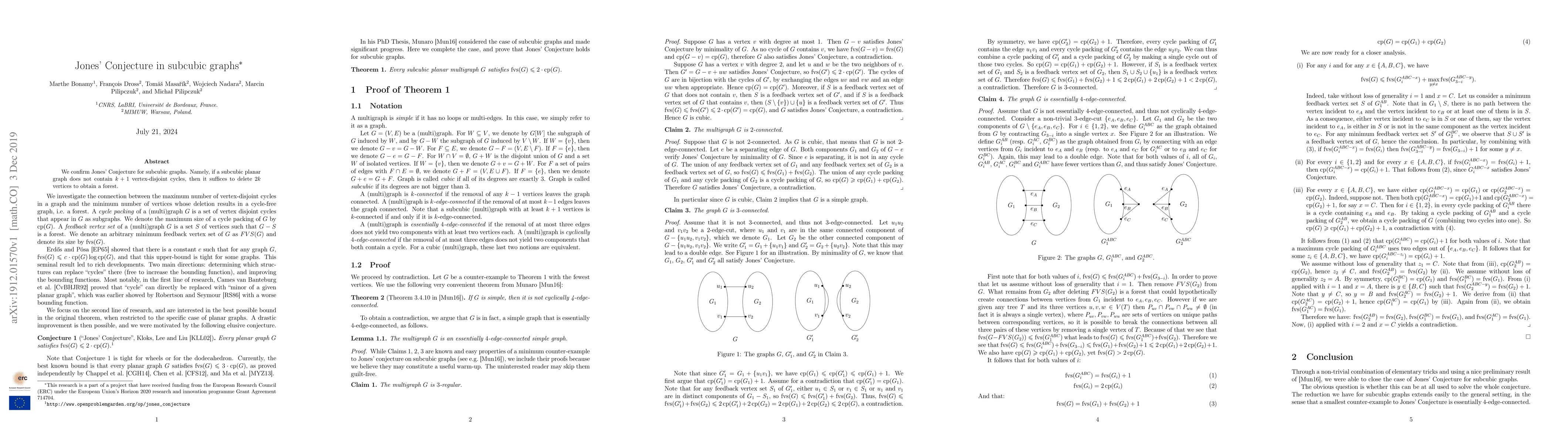 This paper confirms Jones' Conjecture for subcubic graphs, showing that removing 2k vertices from a planar graph without k+1 disjoint cycles results in a forest.