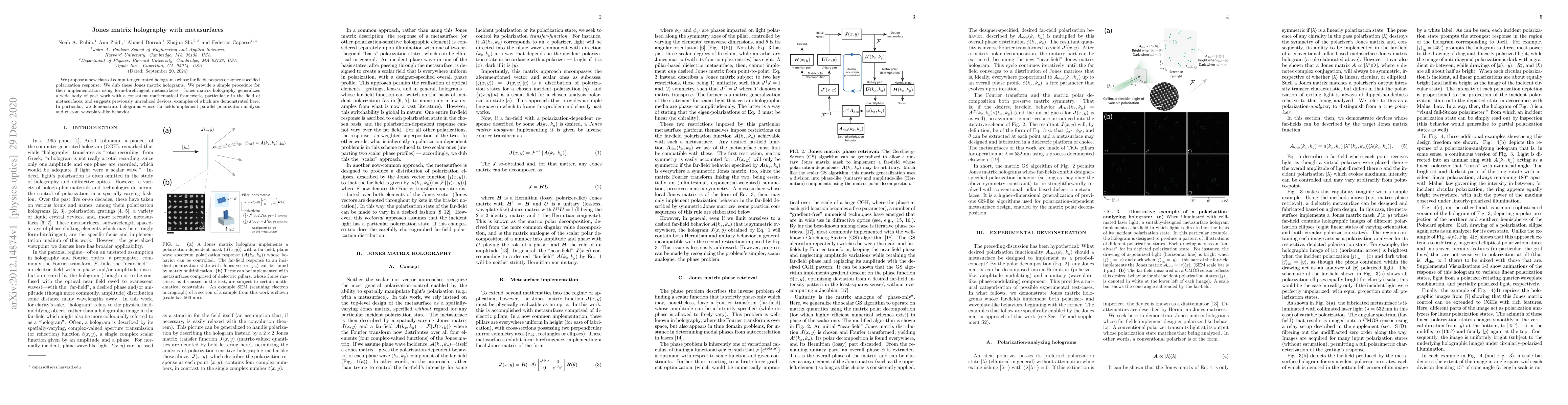 This paper introduces Jones matrix holography, a novel method for creating computer-generated holograms with customizable polarization responses, implemented via form-birefringent metasurfaces. The approach generalizes existing metasurface research and enables new devices, such as parallel polarization analysis and custom waveplate functionalities.