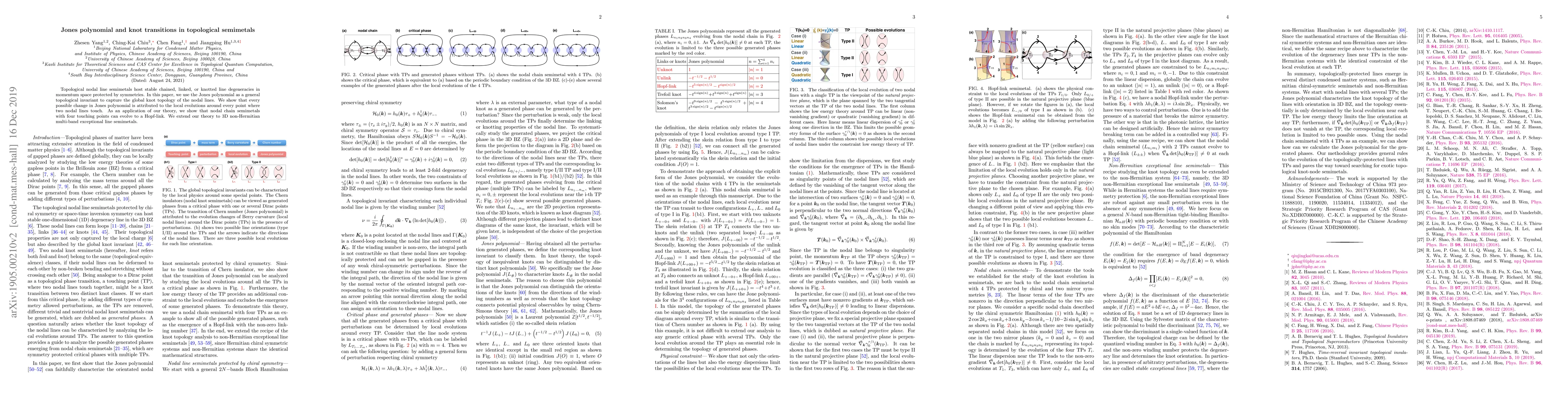 This paper employs the Jones polynomial to study the knot topology of nodal lines in topological semimetals, demonstrating how changes in the polynomial correlate with local nodal line interactions. It applies this theory to show that nodal chain semimetals can evolve into a Hopf-link and extends the approach to 3D non-Hermitian multi-band systems.
