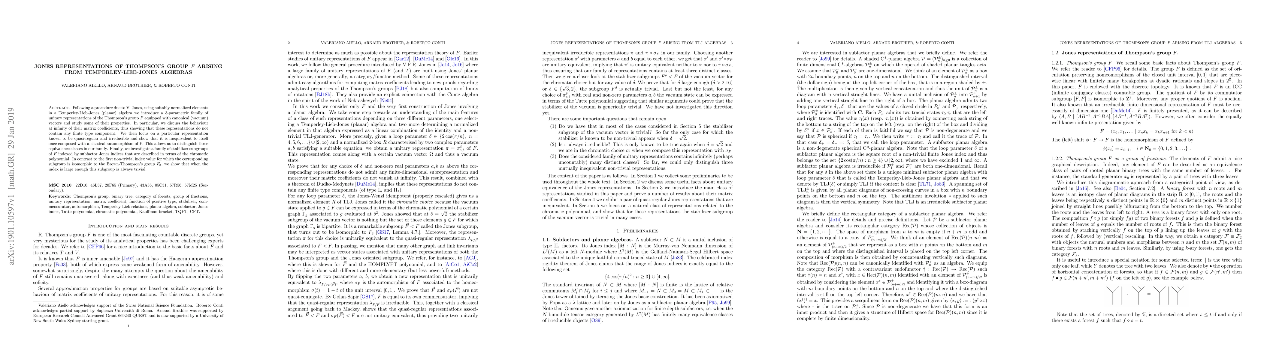 Following a procedure due to V. Jones, using suitably normalized elements in a Temperley-Lieb-Jones (planar) algebra we introduce a 3-parametric family of unitary representations of the Thompson's group $F$ equipped with canonical (vacuum) vectors and study some of their properties. In particular, we discuss the behaviour at infinity of their matrix coefficients, thus showing that these representations do not contain any finite type component. We then focus on a particular representation known to be quasi-regular and irreducible and show that it is inequivalent to itself once composed with a classical automorphism of F. This allows us to distinguish three equivalence classes in our family. Finally, we investigate a family of stabilizer subgroups of $F$ indexed by subfactor Jones indices that are described in terms of the chromatic polynomial. In contrast to the first non-trivial index value for which the corresponding subgroup is isomorphic to the Brown-Thompson's group $F_3$, we show that when the index is large enough this subgroup is always trivial.