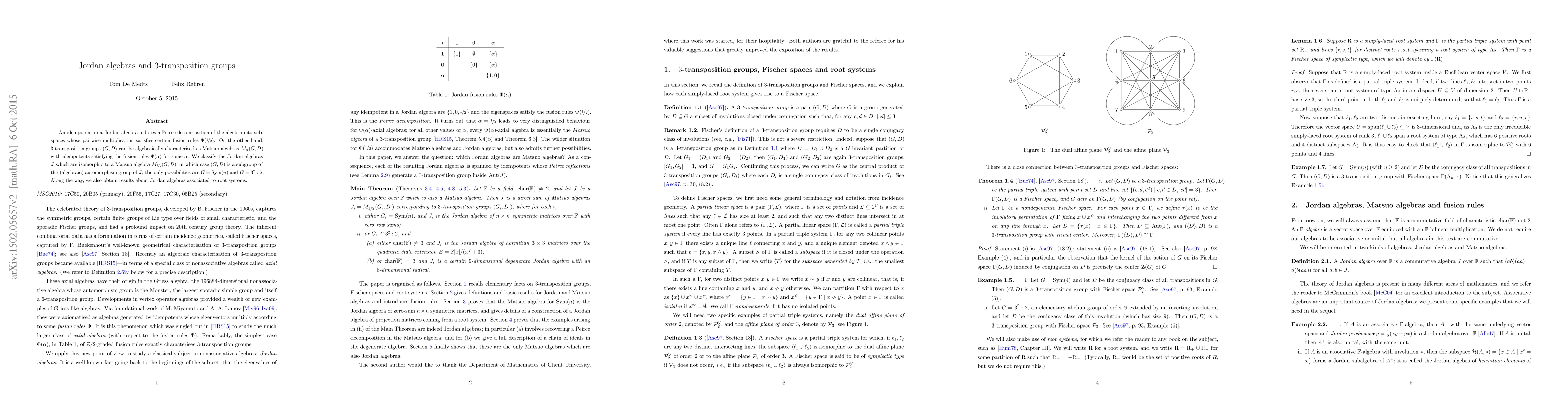 An idempotent in a Jordan algebra induces a Peirce decomposition of the algebra into subspaces whose pairwise multiplication satisfies certain fusion rules $\Phi(\frac{1}{2})$. On the other hand, $3$-transposition groups $(G,D)$ can be algebraically characterised as Matsuo algebras $M_\alpha(G,D)$ with idempotents satisfying the fusion rules $\Phi(\alpha)$ for some $\alpha$. We classify the Jordan algebras $J$ which are isomorphic to a Matsuo algebra $M_{1/2}(G,D)$, in which case $(G,D)$ is a subgroup of the (algebraic) automorphism group of $J$; the only possibilities are $G = \operatorname{Sym}(n)$ and $G = 3^2:2$. Along the way, we also obtain results about Jordan algebras associated to root systems.