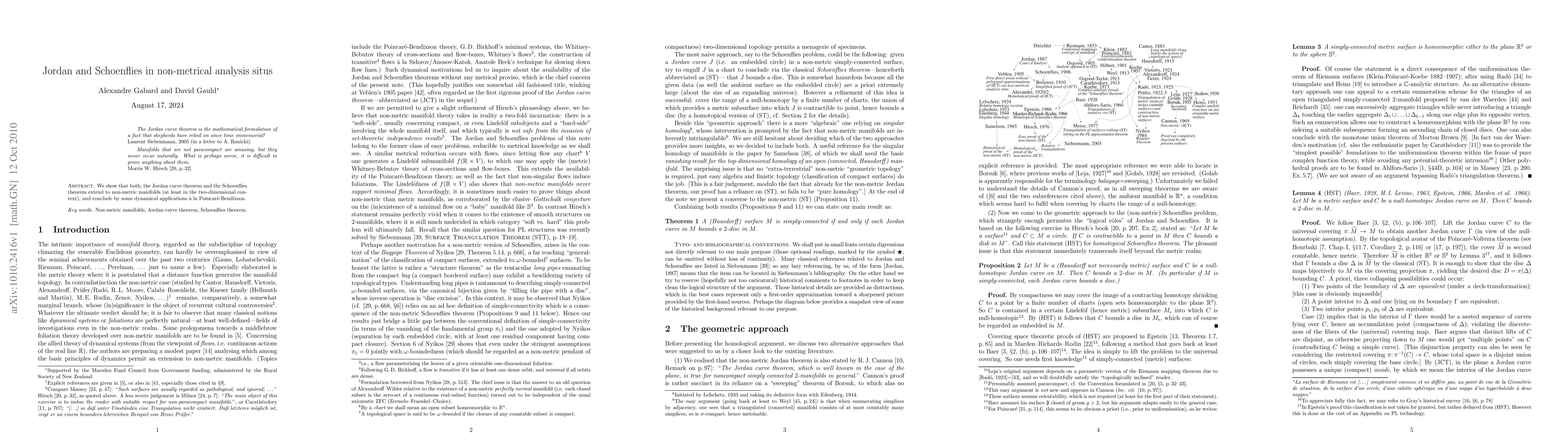 We show that both, the Jordan curve theorem and the Schoenflies theorem extend to non-metric manifolds (at least in the two-dimensional context), and conclude by some dynamical applications \`a la Poincar\'e-Bendixson.