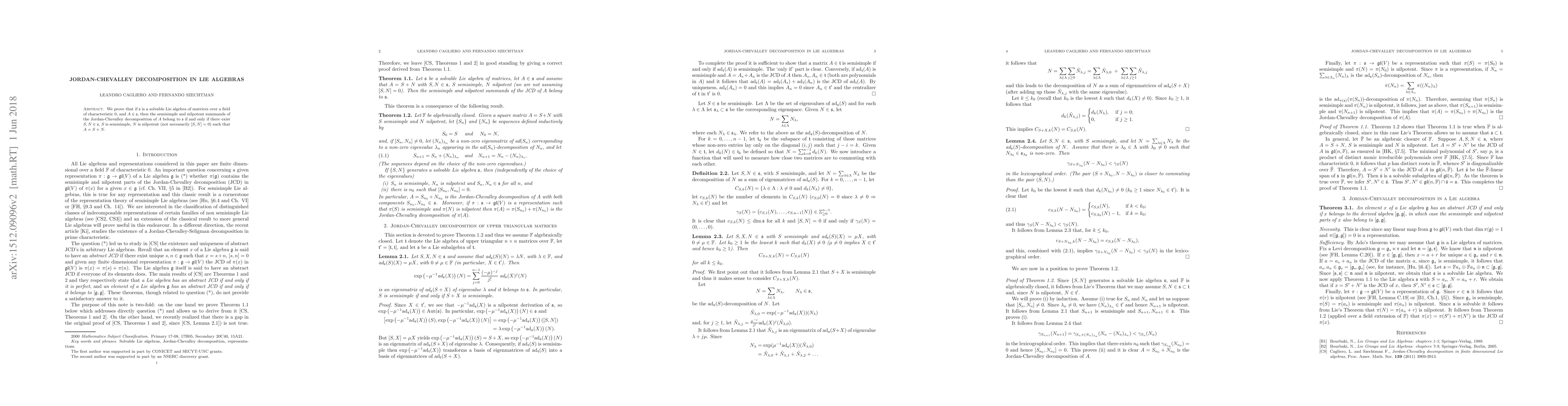 The paper proves that for a solvable Lie algebra $\mathfrak{s}$ in characteristic 0, the Jordan-Chevalley decomposition of any element $A\in\mathfrak{s}$ yields semisimple and nilpotent components that also belong to $\mathfrak{s}$, provided there exist $S,N\in\mathfrak{s}$ such that $A=S+N$ with $S$ semisimple and $N$ nilpotent.